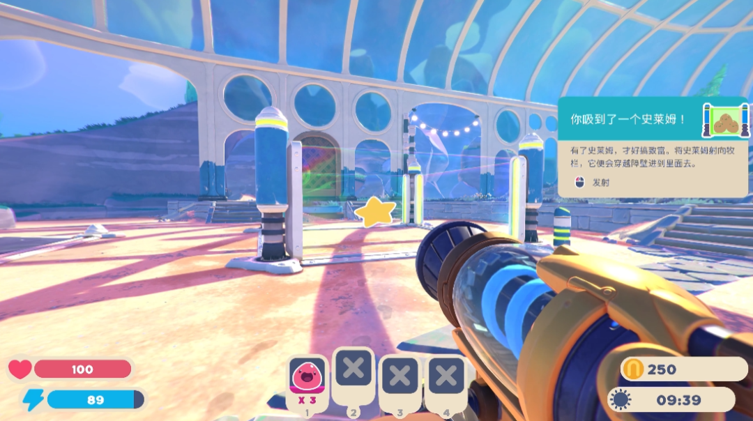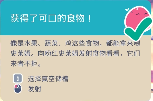 在游戏的新手引导过程中,玩家将会学习基础的移动、真空枪的使用以及如何建造牧栏、养殖史莱姆、利用史莱姆生产的结晶换取金币。新手引导中的每一个步骤都会有相应的指引,闪动跳跃的星星会告诉玩家需要前往的地方,同时在屏幕的右侧会出现对应的提示框,指引玩家进行操作。
