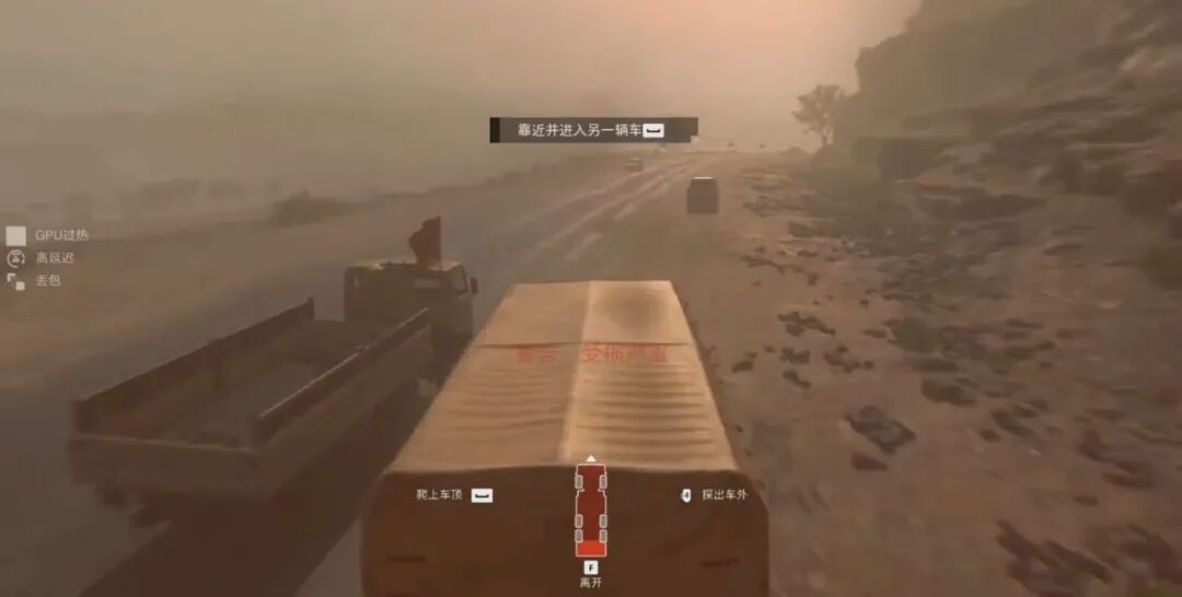 相应地,交互设计也配合了这一场盛大的演出,在其中起着关键的辅助作用。首先,完善的碰撞反馈是整个追逐战的基石。与其他车辆产生碰撞作为最常出现的交互行为,碰撞时的视觉特效与视角晃动都能很好地表现冲突的激烈。其次,飞身劫车时的距离感把控也很合理。当车辆状态较差时,玩家需要接近另一辆车并跳到该车上。此时将会根据距离产生不同的交互提示,只有到达最佳距离,系统才会提示玩家进行交互,以降低交互失败的几率。最后,一些交互细节的作用也不容忽视,例如不同车速下的准星摇晃和屏幕边缘虚化、地雷区其他车辆躲避地雷的反馈、碰撞时无法探头开枪等。