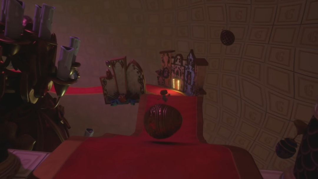 游戏不止是通过角色内心独白、搜集记忆碎片来体现角色气质,有时场景也会被直接用来叙事:某角色的脑内世界中使用了类似迪士尼中”小小世界“的游玩方式,直接串起了人物的背景生平;另一角色则直接挪用了工作室在短期项目中制作的游戏,一个类似分手厨房的做菜环节,玩家需要尽力取悦裁判,在每次拿奖前还需要与内心的各种情绪战斗,并以此表达角色内心对自我的审判等精神问题。