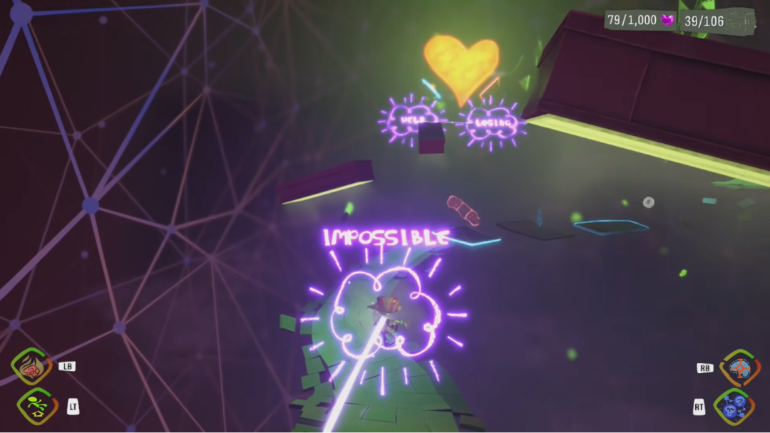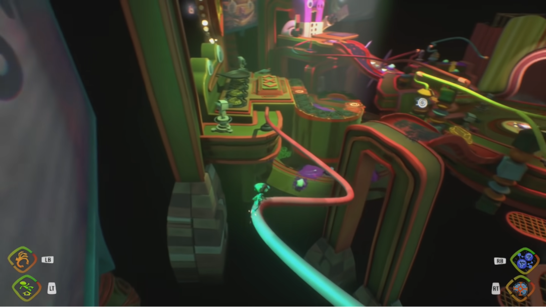 另一方面,连接这些思想泡泡也可以加快游戏进程,在空间里迅速地移动也为玩家带来了一些爽快感受。值得一提的是,游戏主角拉兹是马戏团家族出身,自小练就的好身手使得他能够在游戏内不少的场景中飞檐走壁、时不时再来一次“滑轨过山车”。