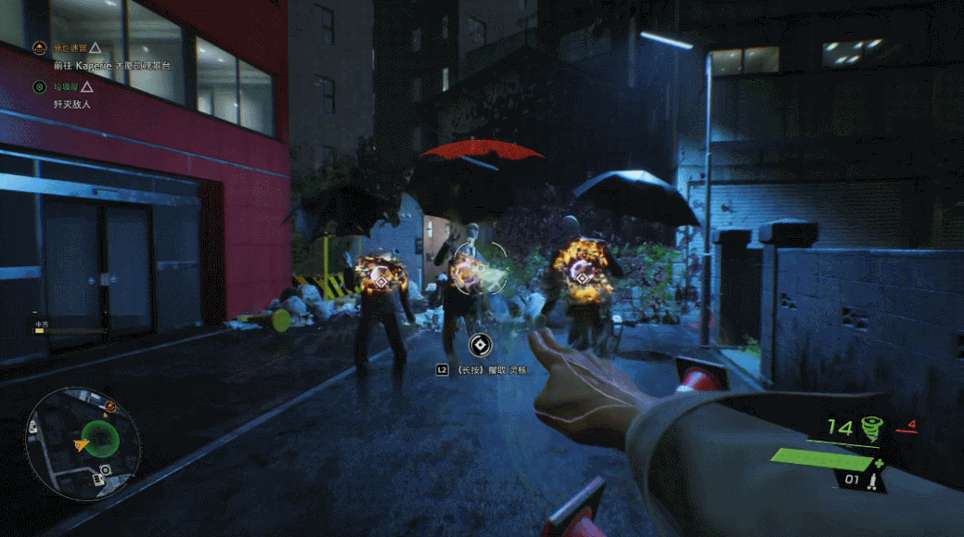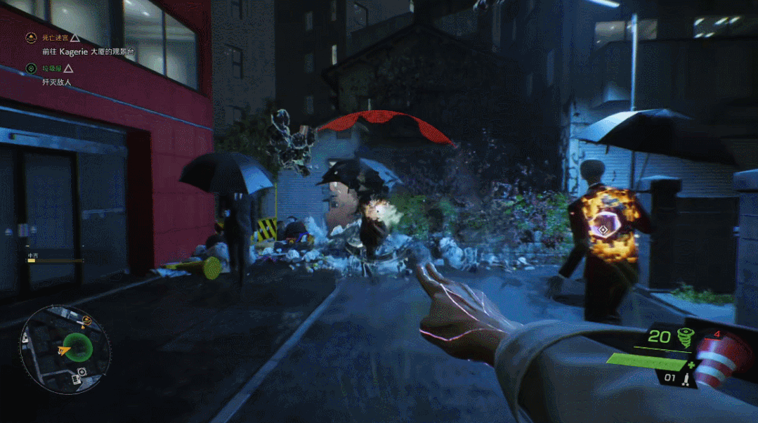 玩家在涩谷街头随处会遭遇身着现代服装的、由都市人们的怨念化成的鬼魂。当它们靠近玩家时,中心一圈的视野会在怪物的位置方向出现颜色提示,从被发现到开始攻击逐渐由黄变红。当面对多个怪物时,会在不同的方位提示怪物位置,帮助玩家快速了解战场局势。如果在街上遇到怪物,路旁的路灯也会随之亮起,由黄色变成红色,警示玩家,这样的设计既渲染了紧张的气氛,也为玩家应对即将出现的怪物提供了心理上的缓冲期。