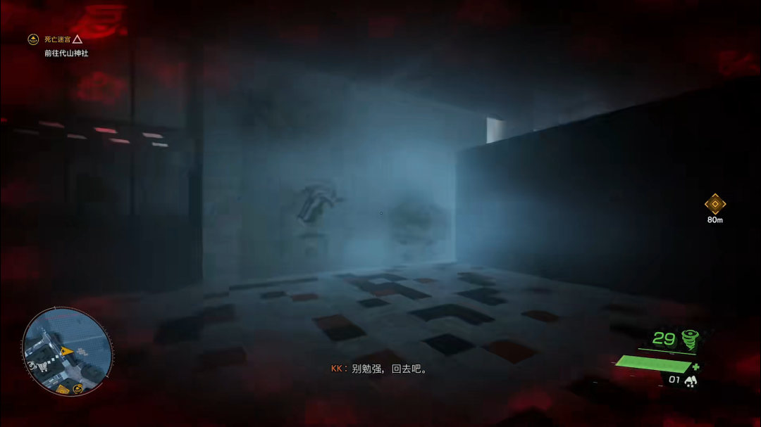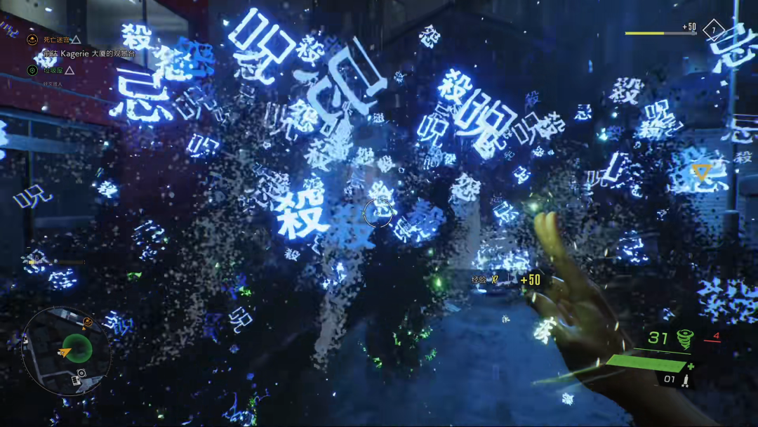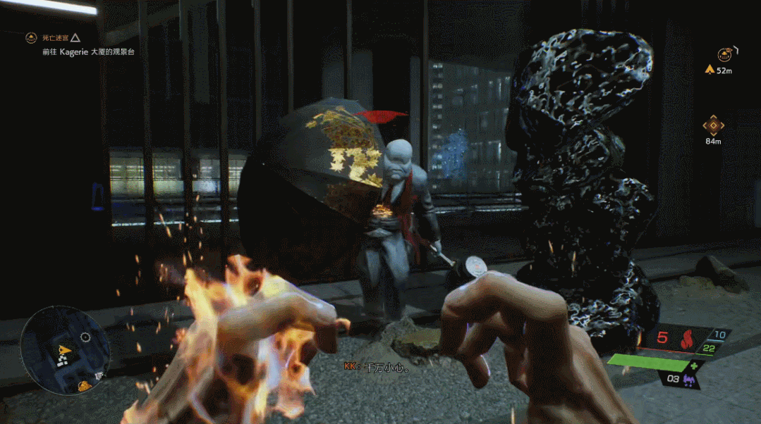 《幽灵线:东京》作为一款开放世界游戏,各类地点、任务流程的引导是不可或缺的。在游戏过程中,KK在一定程度上担任了引导者的角色,在游戏开始时附身到主角身上,一步步指示主角进行接下来的动作。在这个过程中逐步让玩家掌握游戏的基础操作,同时推进剧情发展,而在之后的任务中也会给出玩家操作提示。比起《赛博朋克2077》中的强尼银手,KK更偏向于引导者的身份。另外,在游戏过程中主角若是遇到某些突发情况,如生命值过低、进入迷雾、遇到精英敌人时,KK也会通过对话给出相应的操作建议。