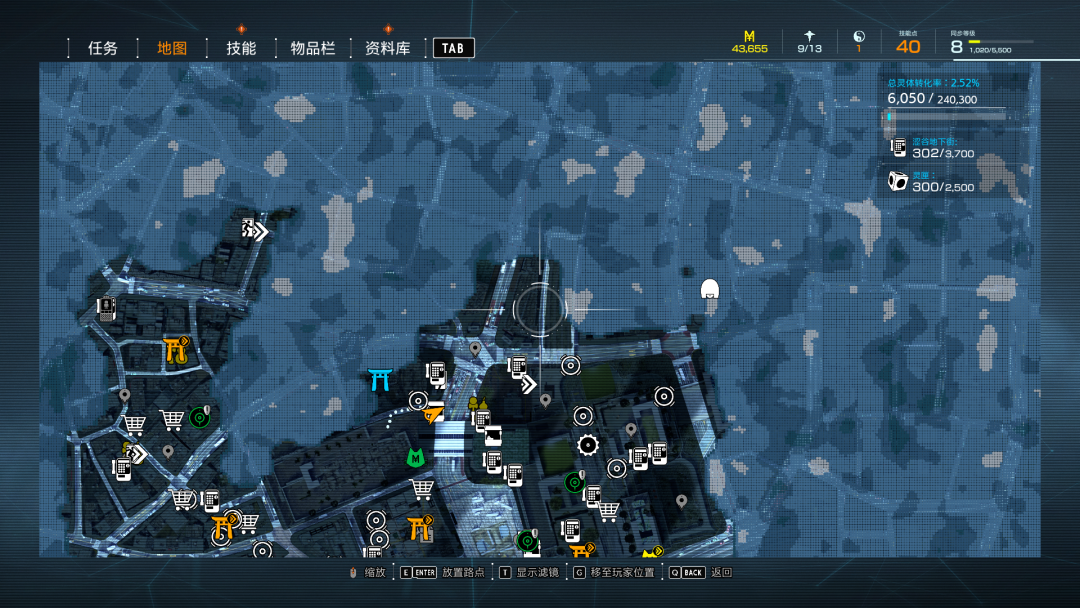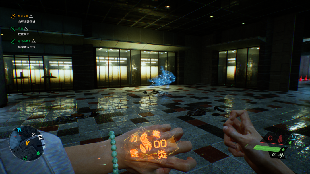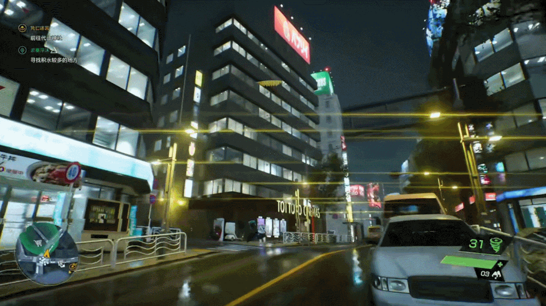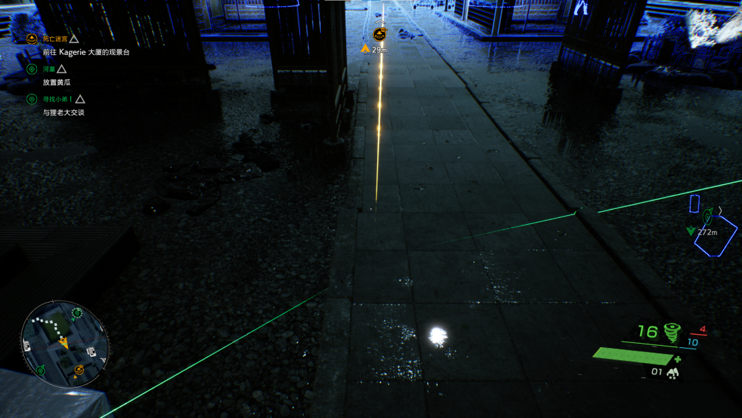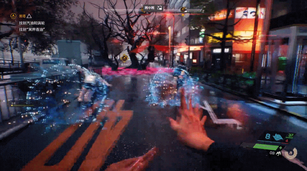 游戏中玩家可以掌握一种称为“灵视”的能力,类似于《刺客信条》中的“鹰眼视觉”,或者《巫师3》中的“猎魔感官”,可以探知环境中常人看不见的事物。这类能力在各种开放世界游戏中早已屡见不鲜。《幽灵线:东京》中的“灵视”能力可以透视障碍物后面的东西,方便玩家熟悉地形,提前规划目的地和路线。另外,在使用“灵视”后,场景中会出现高亮的引导路径。黄色路径代表主线任务,绿色路径代表支线任务,沿着地面、墙体、管道等,指向任务地点,并标示距离,尽可能避免玩家因为视野受限等问题找不到任务目的点。