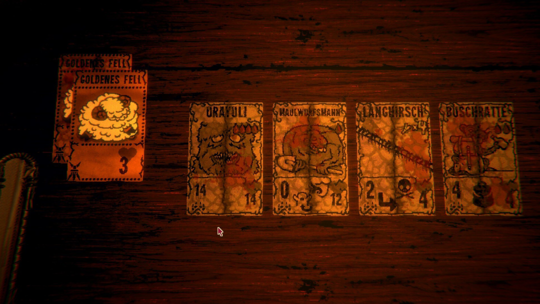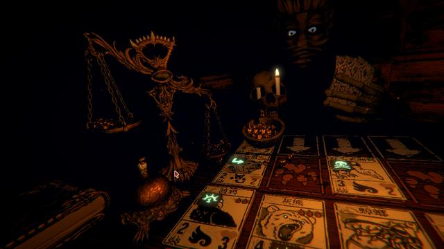 玩家被锁在森林小屋中和一个看不清脸的疯老头打牌,牌桌左侧是一架天枰,这是玩家和这个老头之间计分的主要方式。而天平上放着的砝码,是自己的牙齿,一场赌命牌局。