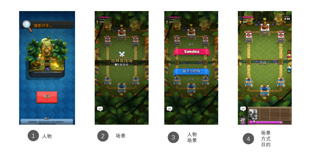 战斗前奏中意识流:这是谁,这在哪,这要做什么,这要怎么做?快速铺垫意识流淌的去向,特别是对于新手玩家,会大大降低理解成本和提高操作的流畅性。在玩家出现疑惑前先一步告诉玩家,让玩家在铺垫好的意识流里流畅体验,从而忽略自我独立意识。下图中荒野乱斗和皇室战争中对于战斗前序的意识流梳理非常有节奏和顺滑。但当跳跃过大或者过度缓慢,则会造成不适,比如皇室战争中的在意识流中对目的的体现(摧毁对方的城堡)较弱,成为整体流畅和刺激的前奏环节中稍弱部分。而现在很多游戏仅用一张loading图用来过渡战斗外到战斗内,实则是非常脱节与欠缺打磨的部分。也是在透支玩家的理解力,强制玩家熟悉路径与目的。对于战斗时的情绪调动也是收效甚微。
