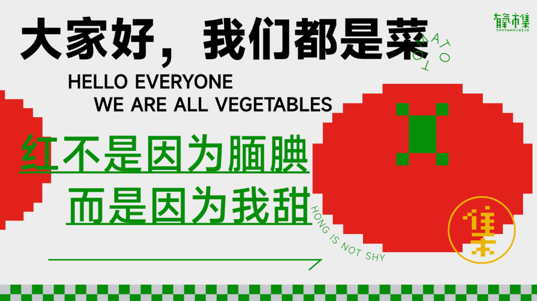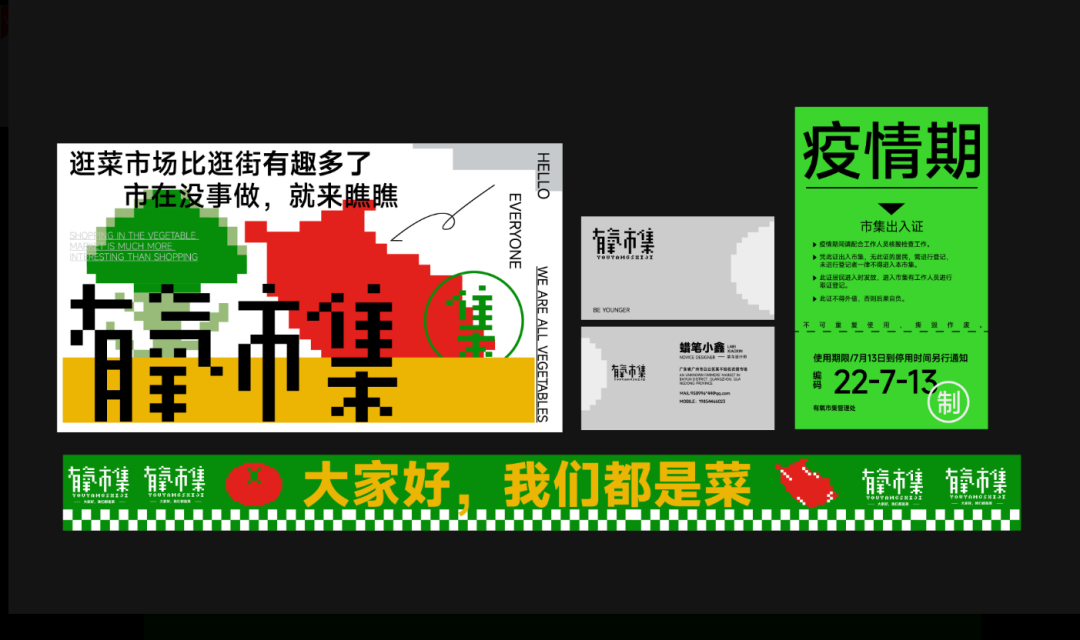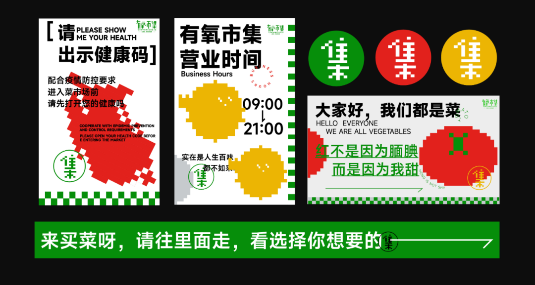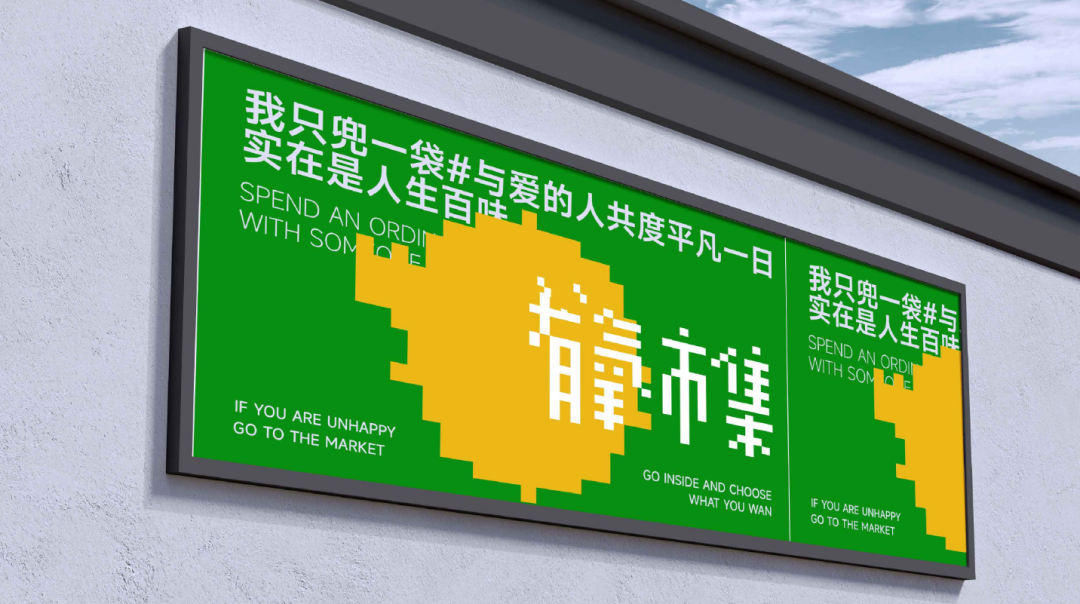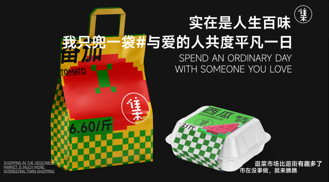 说到菜市场,我们也会觉得脏、乱、丑,但那里却也是充满了生活的朝气。基于此,本次设计围绕着菜市场的各种商品,从农田、到市场、到餐桌,用概念化的方式对菜市场进行像素概念的呈现,来一次关于菜市场生活气息的灵感碰撞,穿达烟火气、年轻化、古灵精怪的氛围。