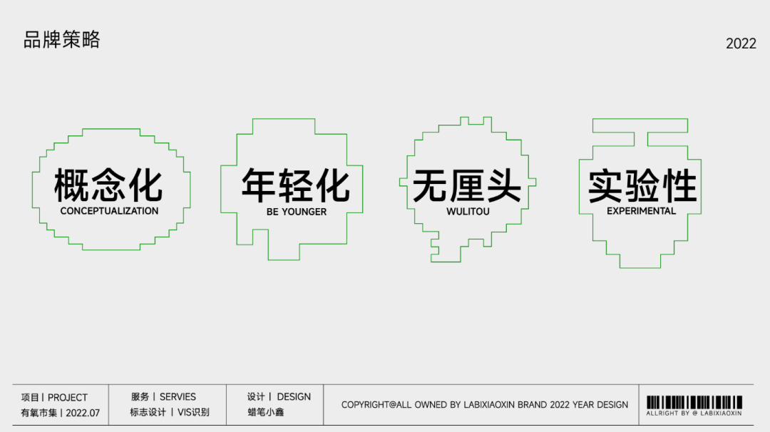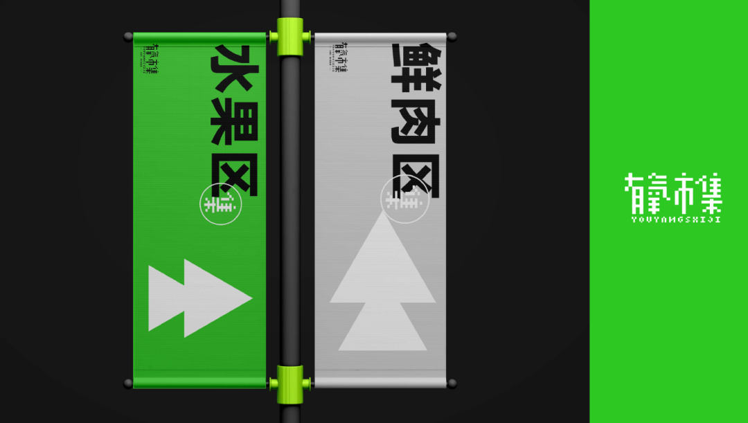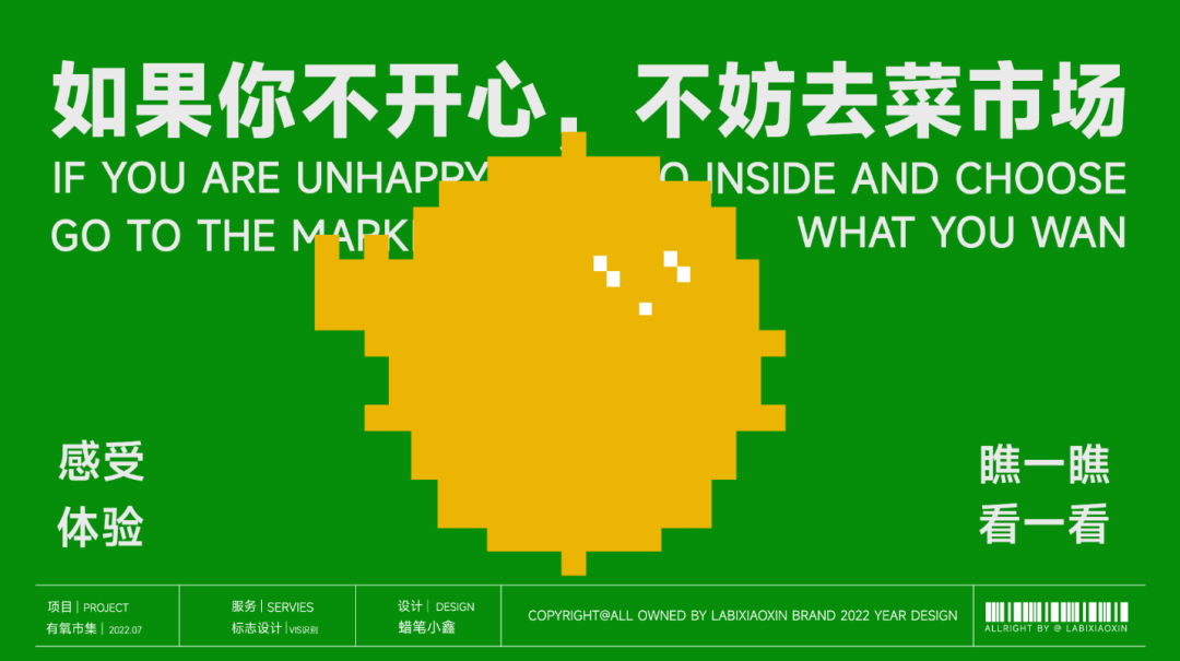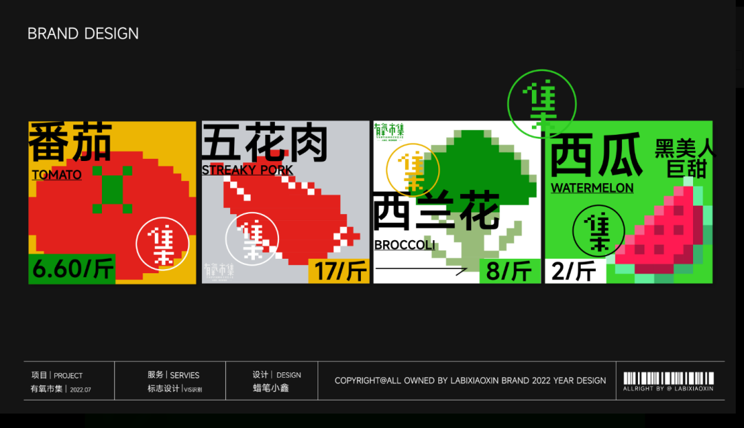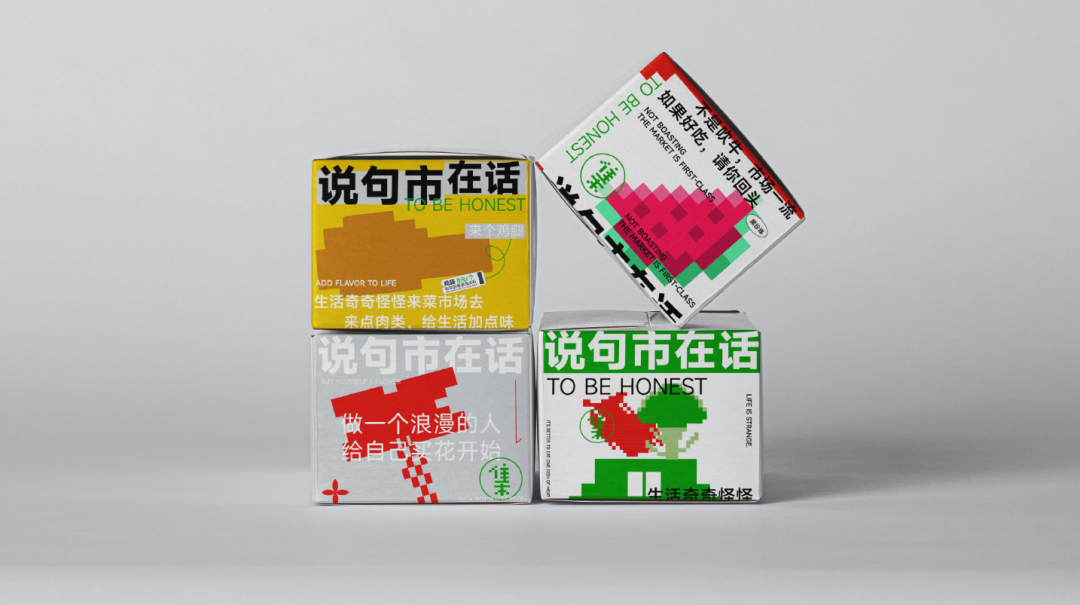 说到菜市场,我们也会觉得脏、乱、丑,但那里却也是充满了生活的朝气。基于此,本次设计围绕着菜市场的各种商品,从农田、到市场、到餐桌,用概念化的方式对菜市场进行像素概念的呈现,来一次关于菜市场生活气息的灵感碰撞,穿达烟火气、年轻化、古灵精怪的氛围。