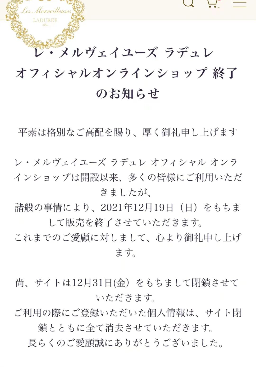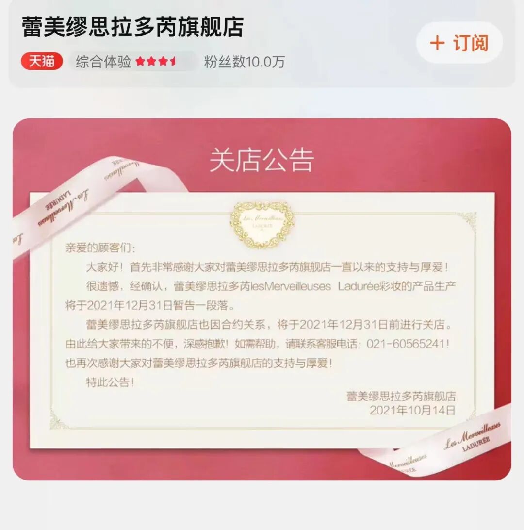 据蕾美缪思拉多芮(Les Merveilleuses LADUREE,以下简称“拉多芮”)官网发布的消息,品牌将于12月19日停止销售,并于12月31日关闭网站。据悉,拉多芮的关停,主要原因为受疫情影响品牌业绩下滑以及与澳尔滨的合约终止等。