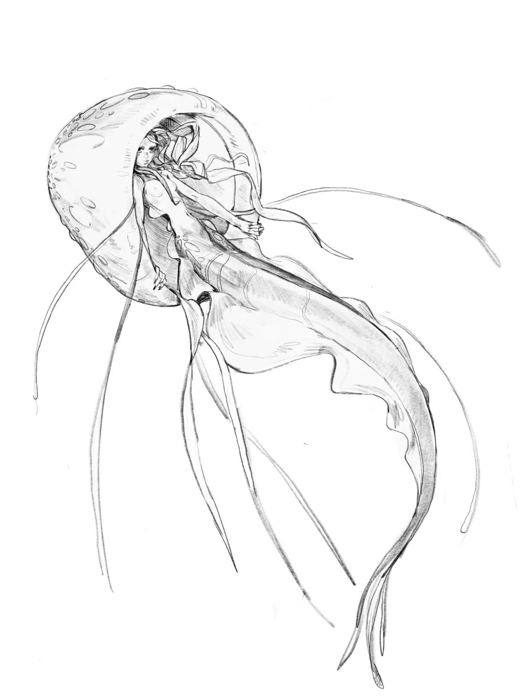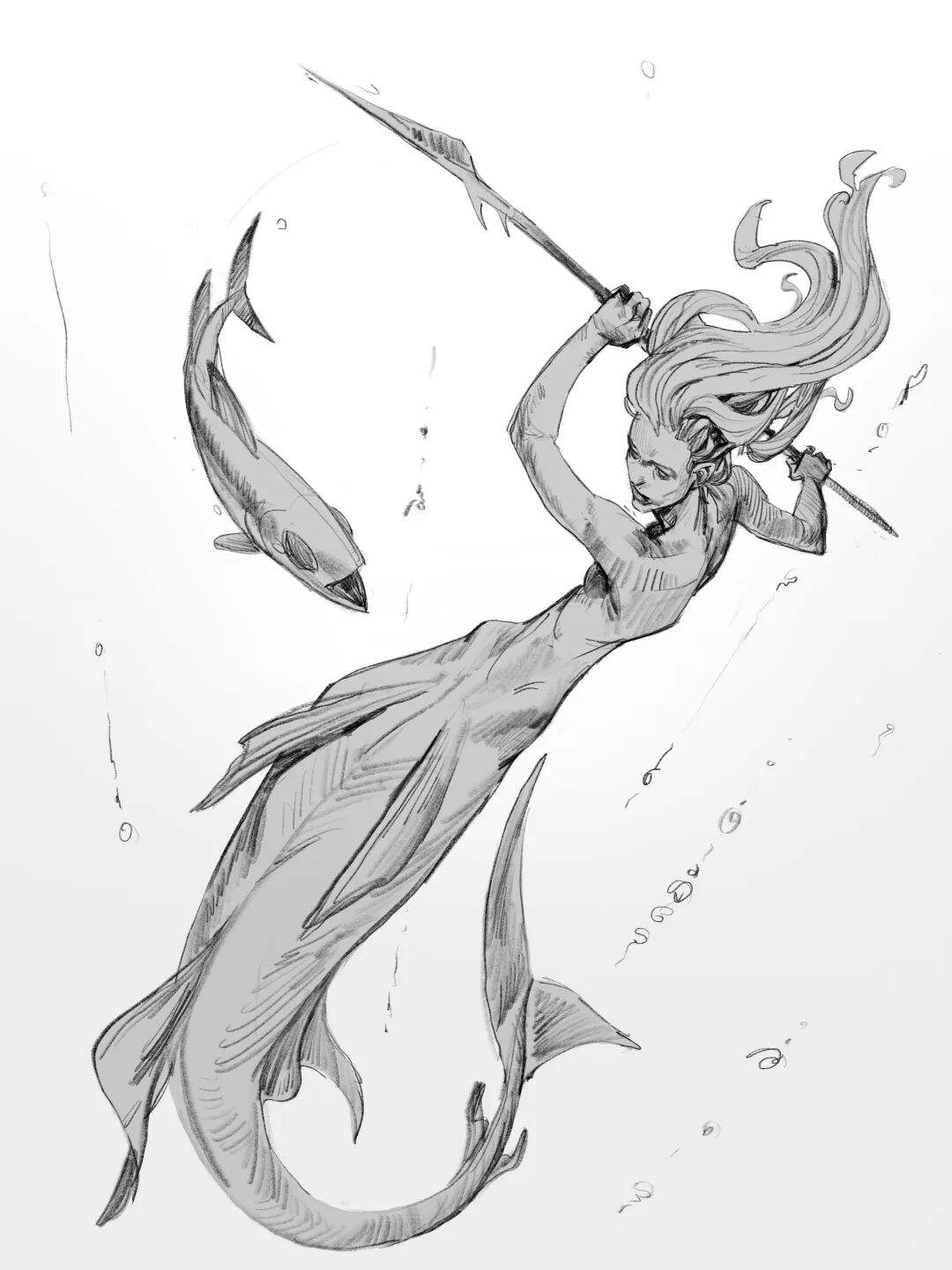 线稿美人鱼作品线条十分流畅,笔触干净,寥寥几笔展现出其灵动飘逸的姿态。