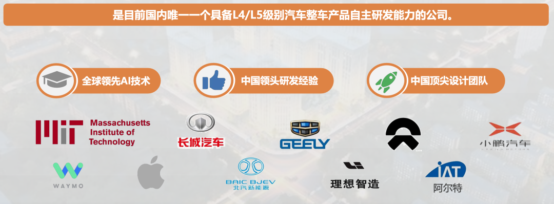 这一页就更有意思了,说自己“目前国内唯一一个具备L4/L5级别汽车整车产品自主研发能力的公司”就算了,下面放上长城、吉利、理蔚鹏、苹果、Waymo的Logo我就不太懂了,难道是恕我直言,在座的各位......?