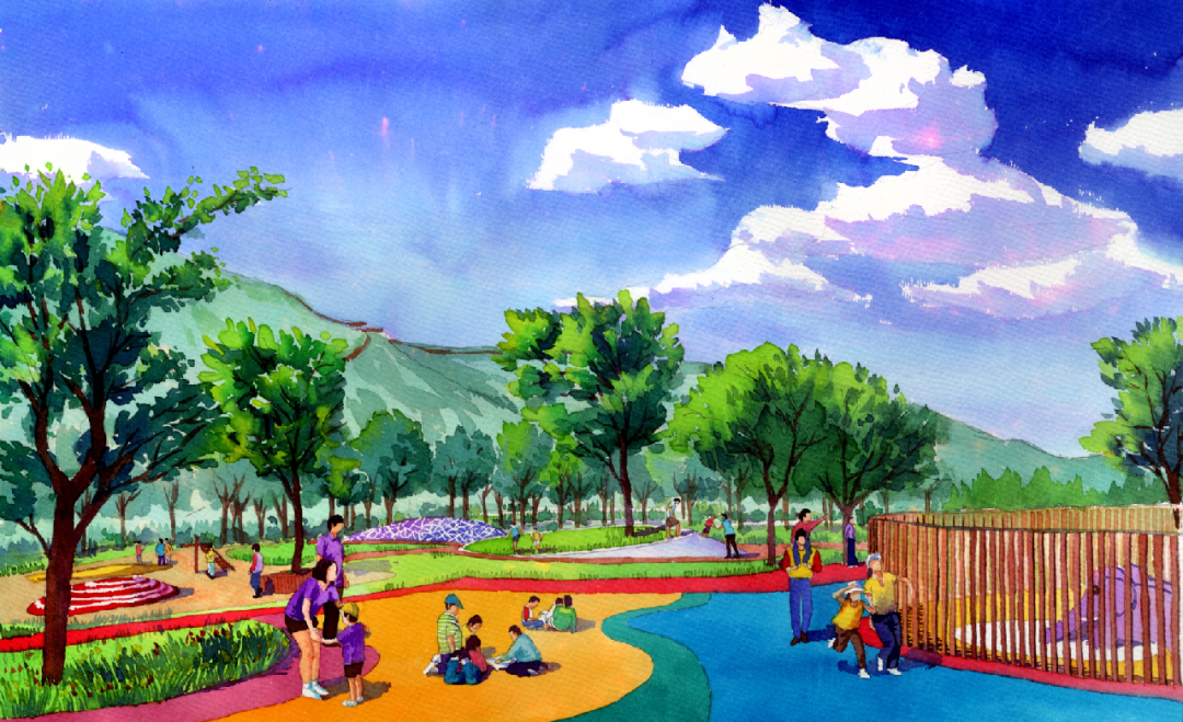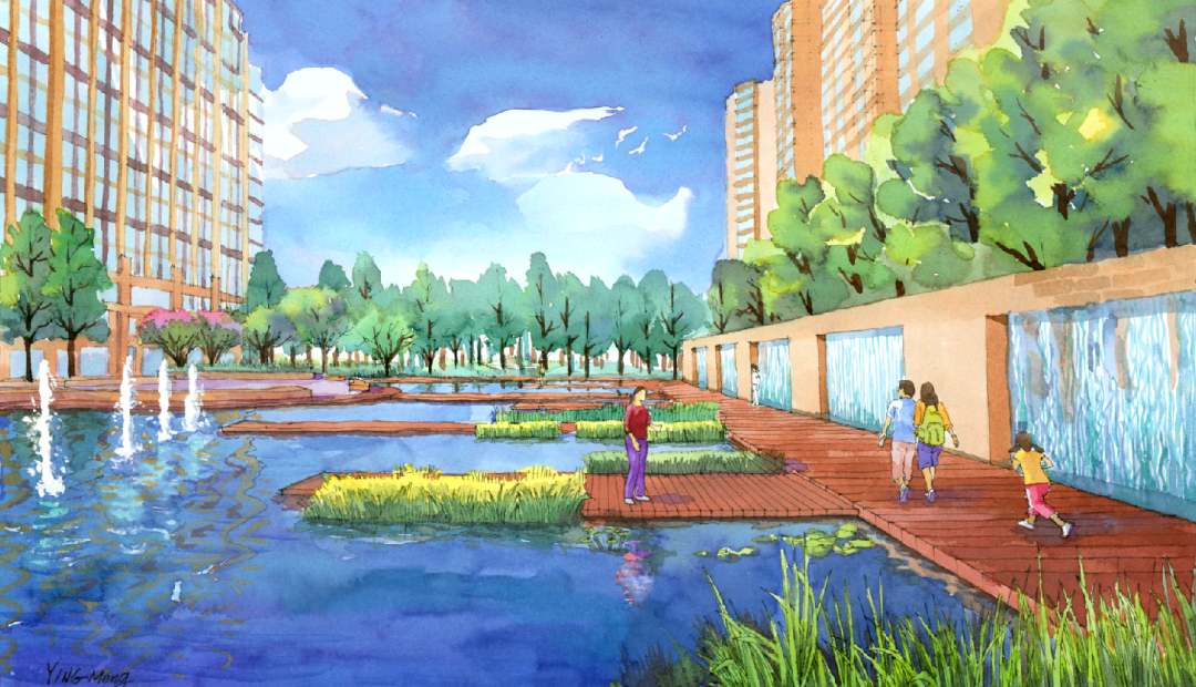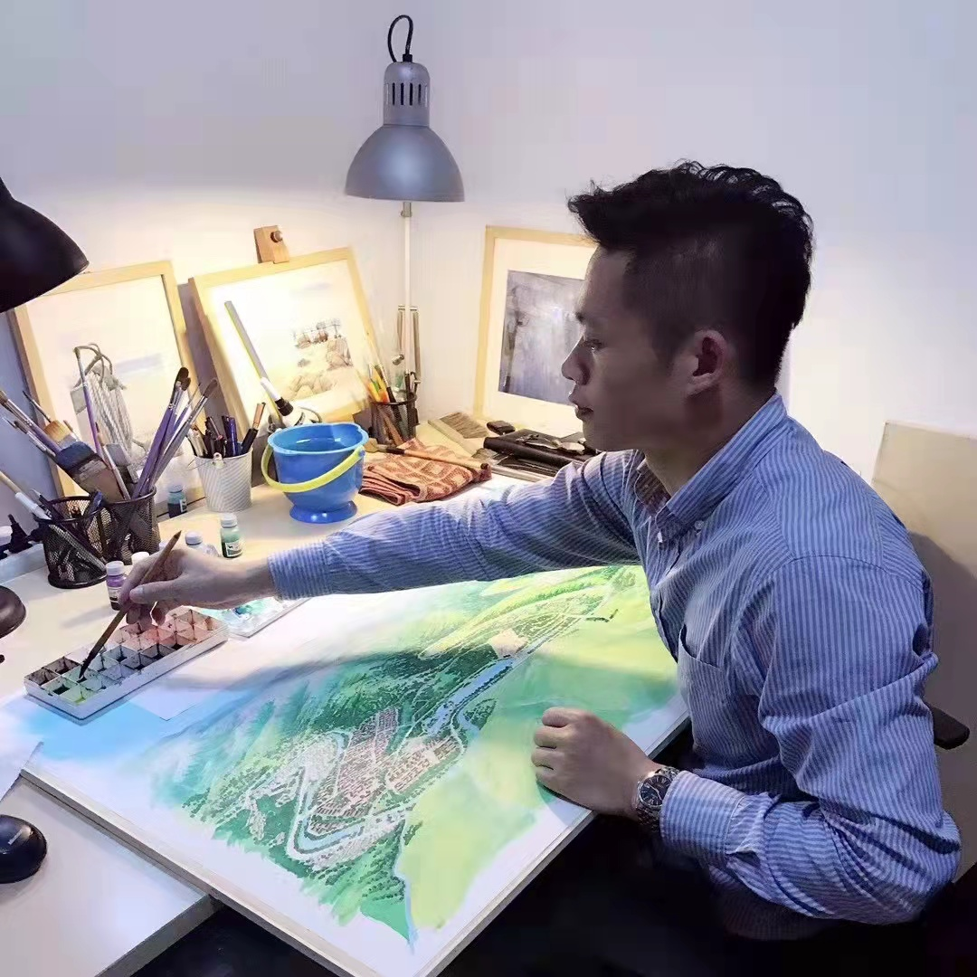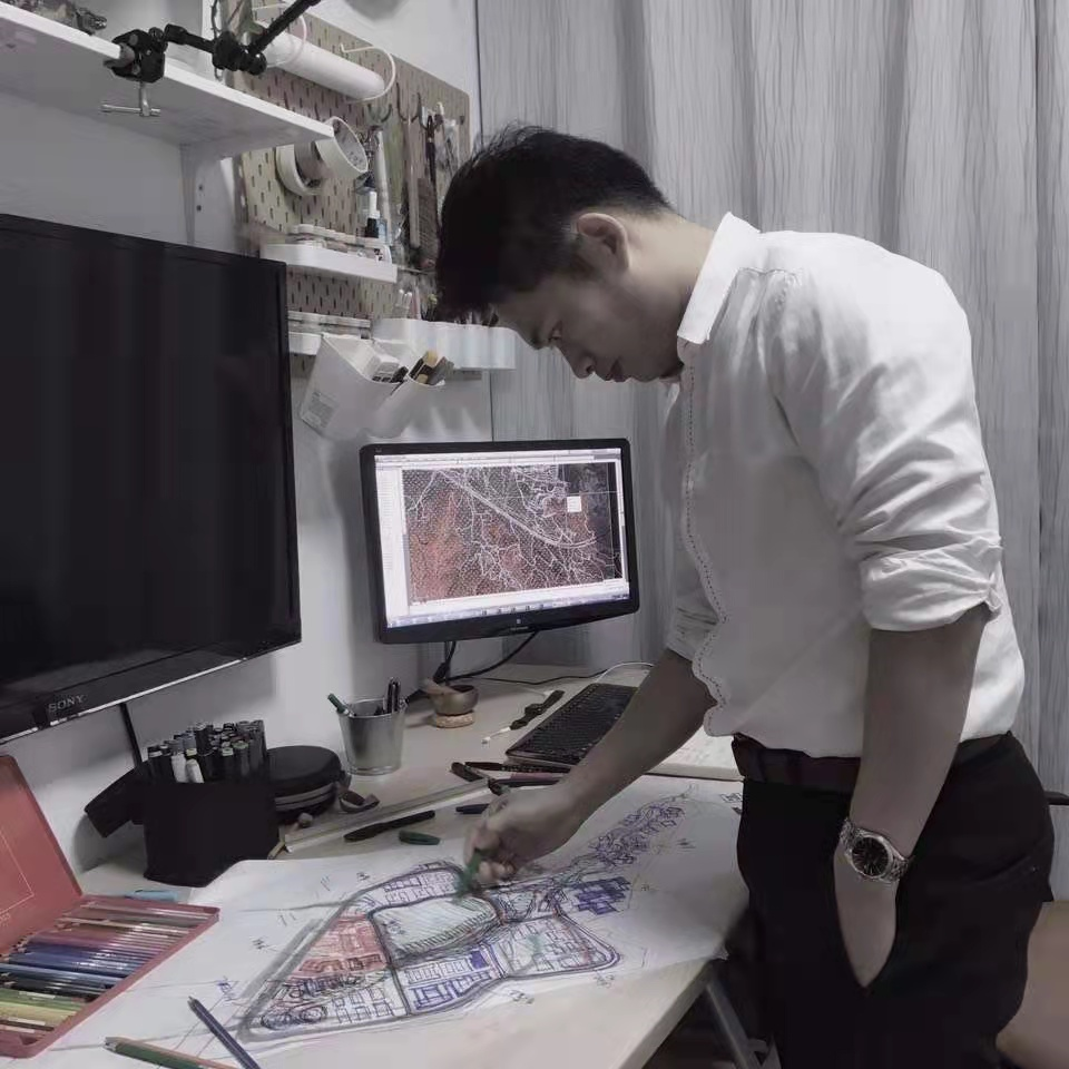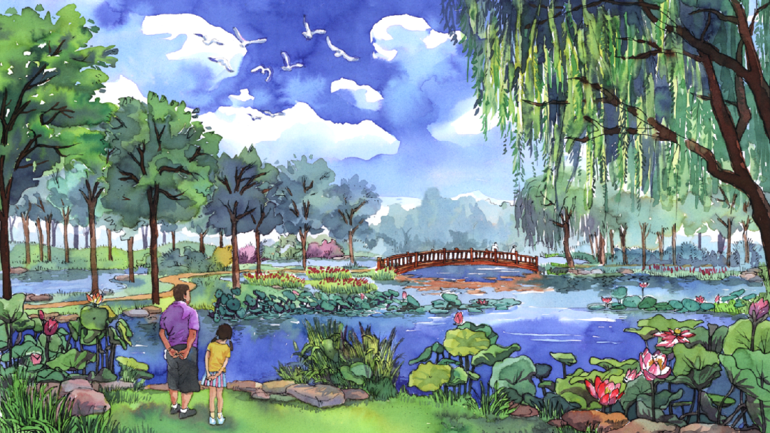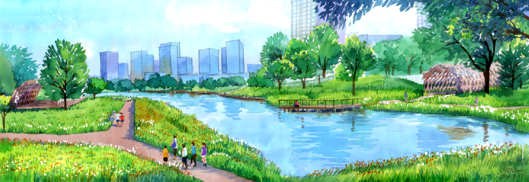 这位我们非常熟悉的老朋友陈应梦美术功底极其深厚,景观手绘图中的配景主要包含:天空、植物、石头、城市、道路铺装、车辆、人物、水体及小型构筑物都在他的手下栩栩如生。