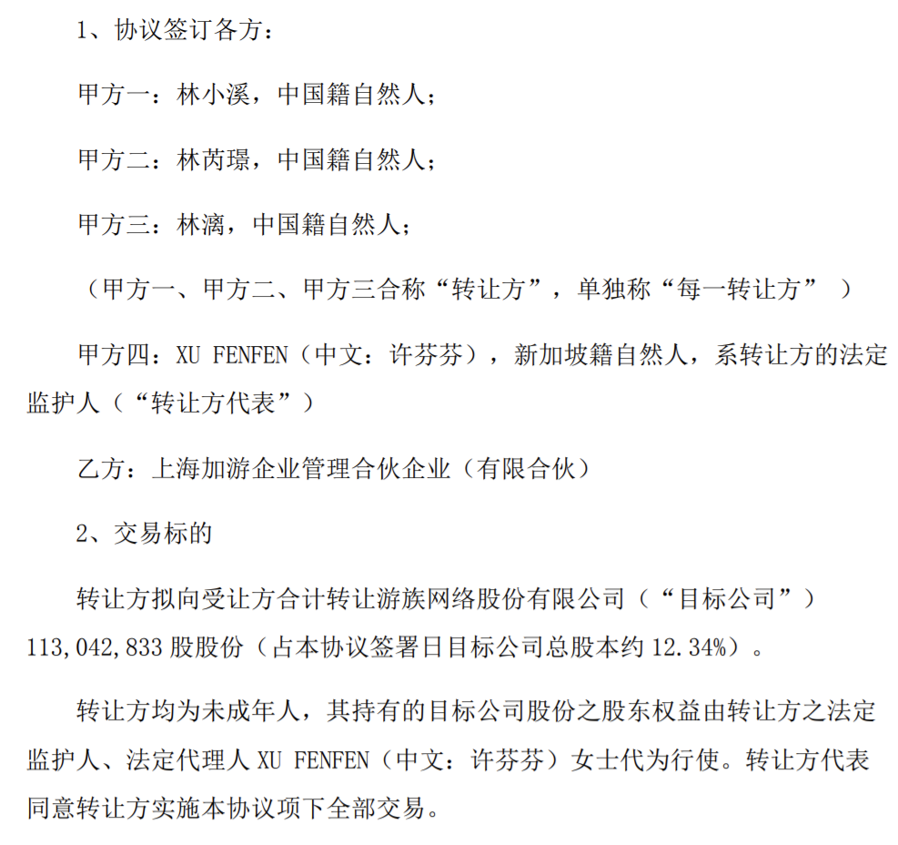 1月2日,游族网络发布了股权转让公告,称公司原实控人林奇三子女及法定监护人,已在去年12月30日,跟上海加游企业管理合伙企业(有限合伙)签署了《股份转让框架协议》,拟转让游族网络12.34%的总股本(1.13亿股)。