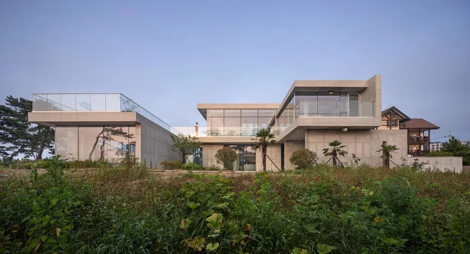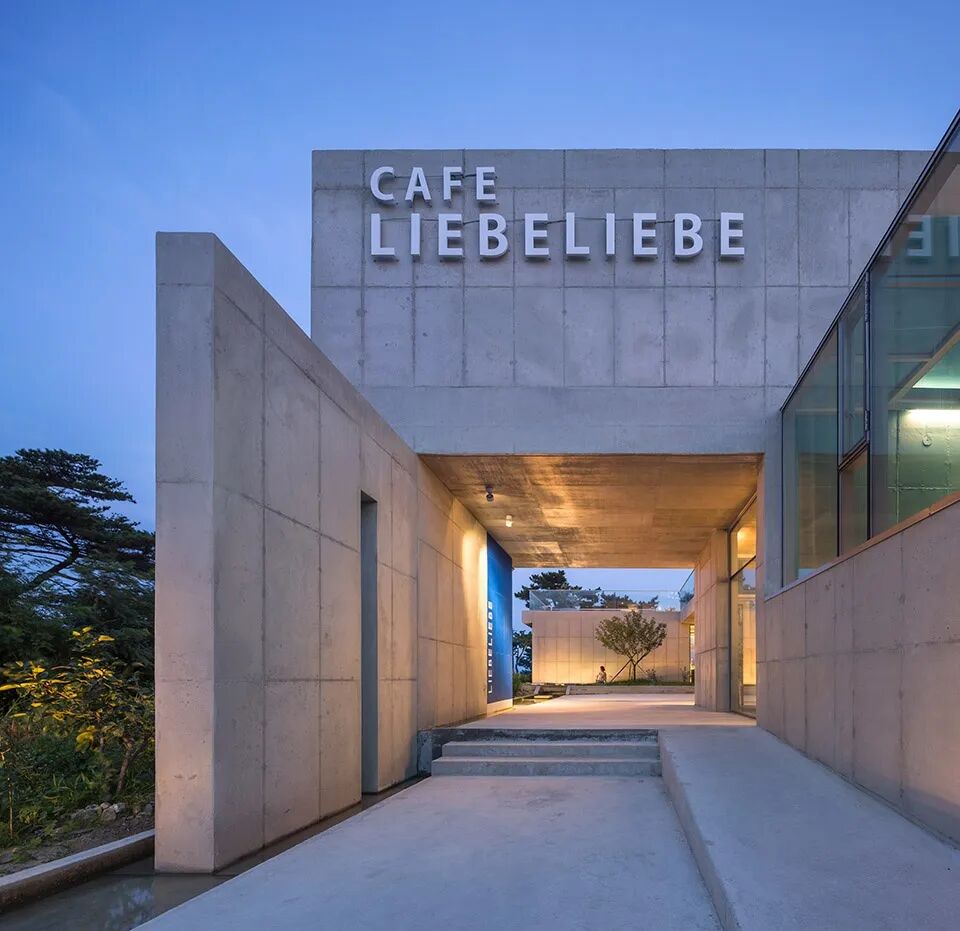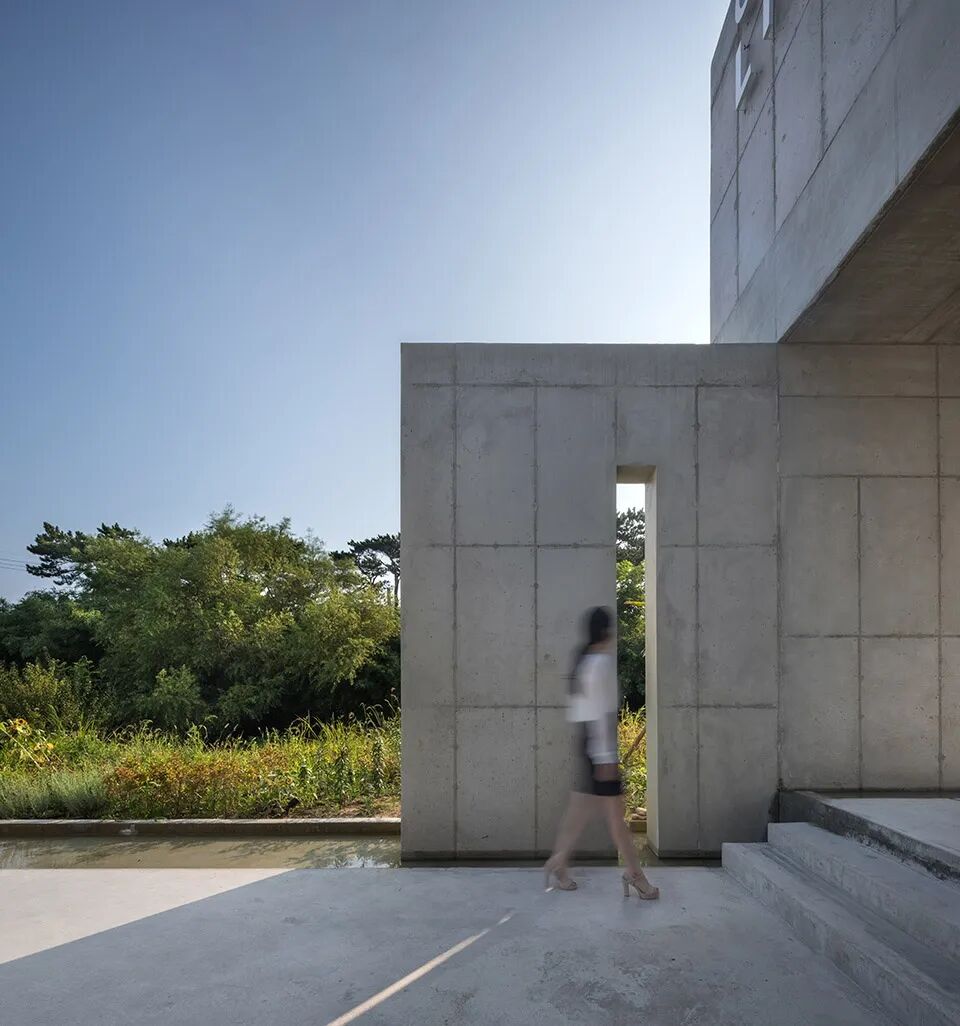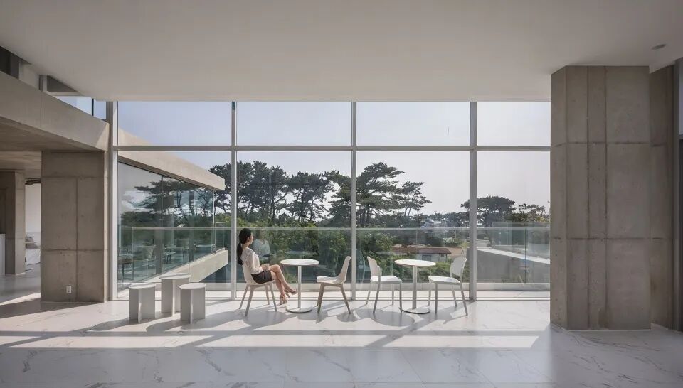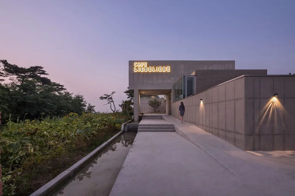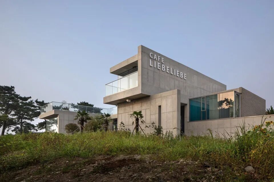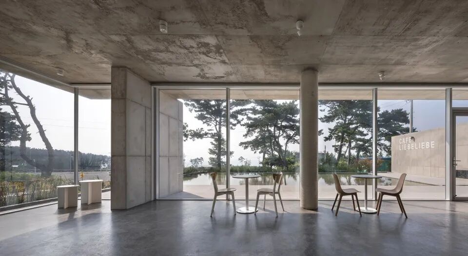 该灰色咖啡馆位于蔚山市Ganjeolgot的崖边,是一个咖啡馆与住宅相结合的项目。项目场地长100m, 宽12-18m,整体长而狭窄。场地的东侧是种有松树,竹子和刺槐的茂密森林,而南侧则是Ganjeolgot崖边的海岸。如何能让旅客感受到场地前方400m处的海岸风光,是该项目的重点。