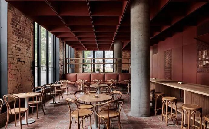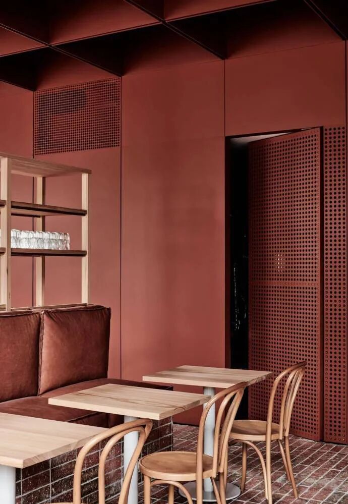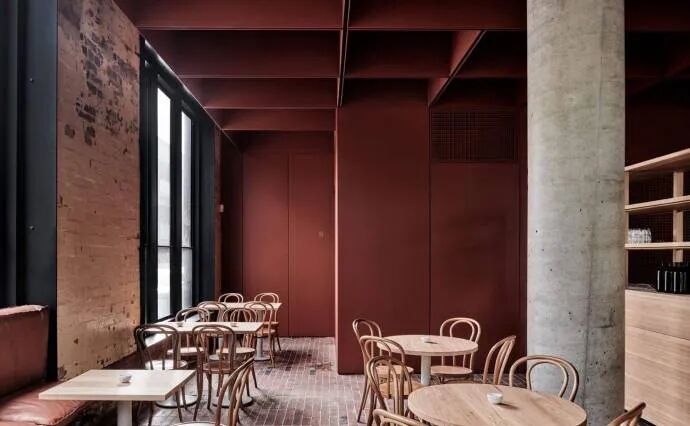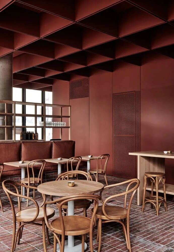 这间咖啡厅以Thonet标志性的装饰品和精美细致的细木家具装饰,完美呈现深红色。