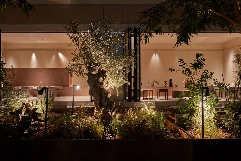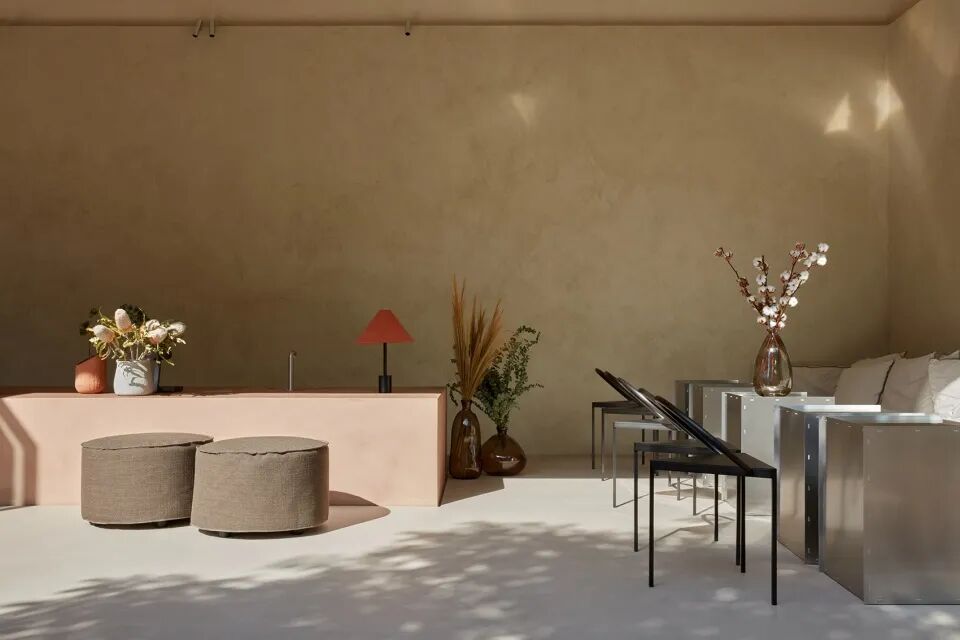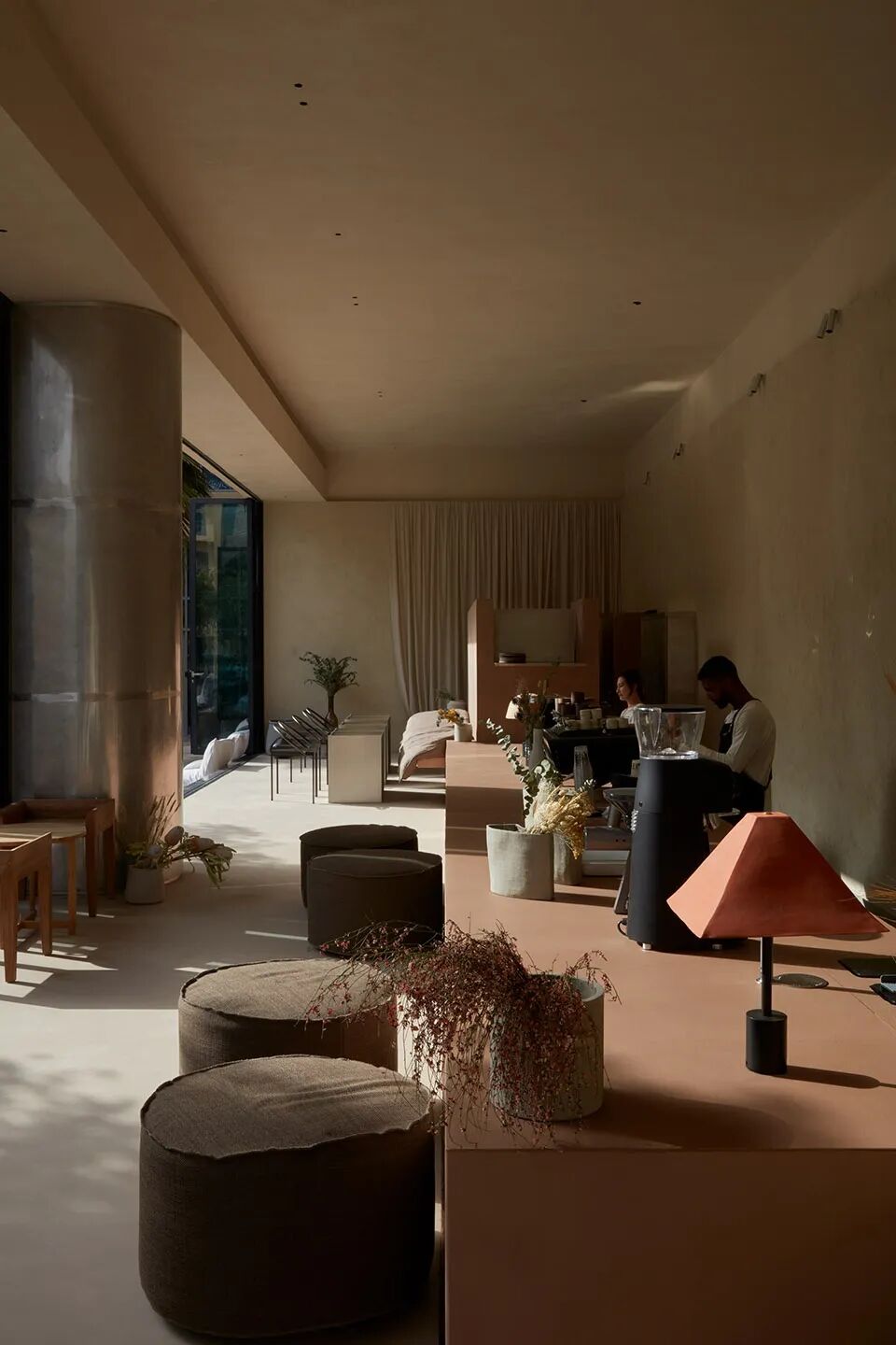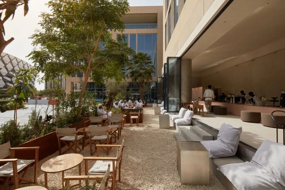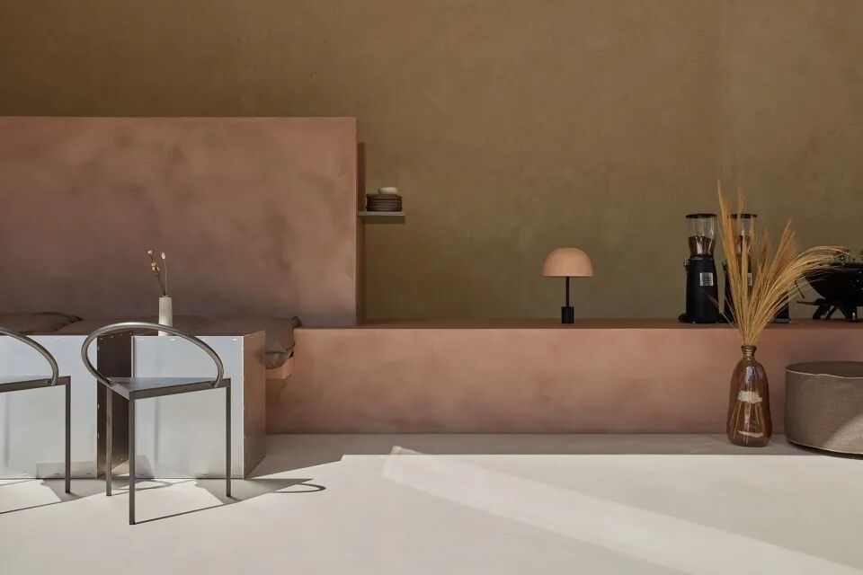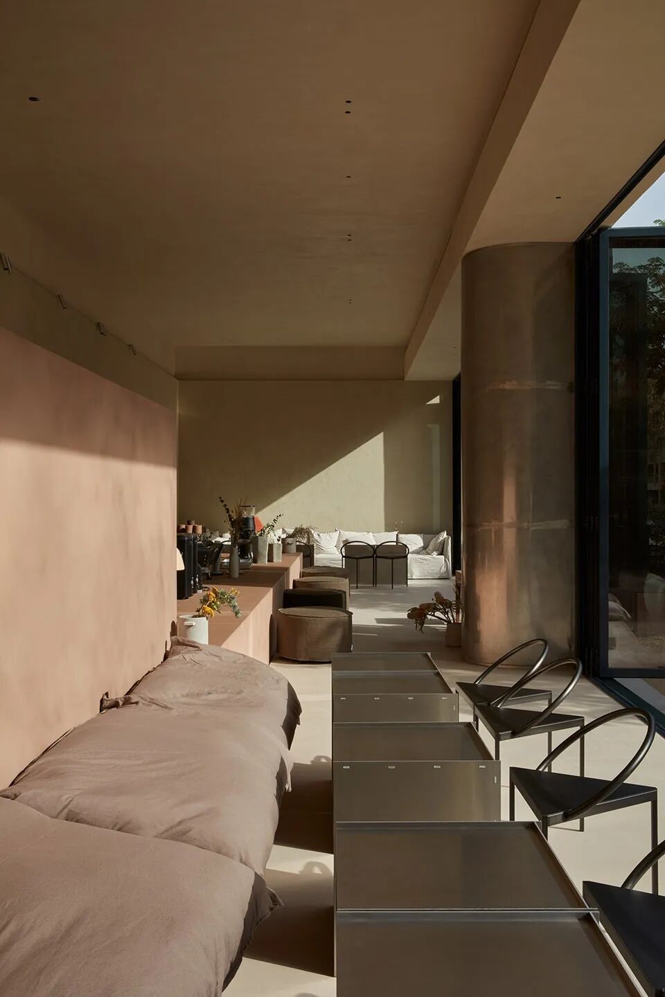 受到艾因市沙漠地貌与景观的启发,设计师将咖啡馆内的座椅与操作台设计成不同的高度,形成分层的效果。这种设置,既增加了座位布局的多样性,又使室内的景观视野直接连通到室外花园,在避免视觉障碍的条件下,保证了顾客对私密性的需求。