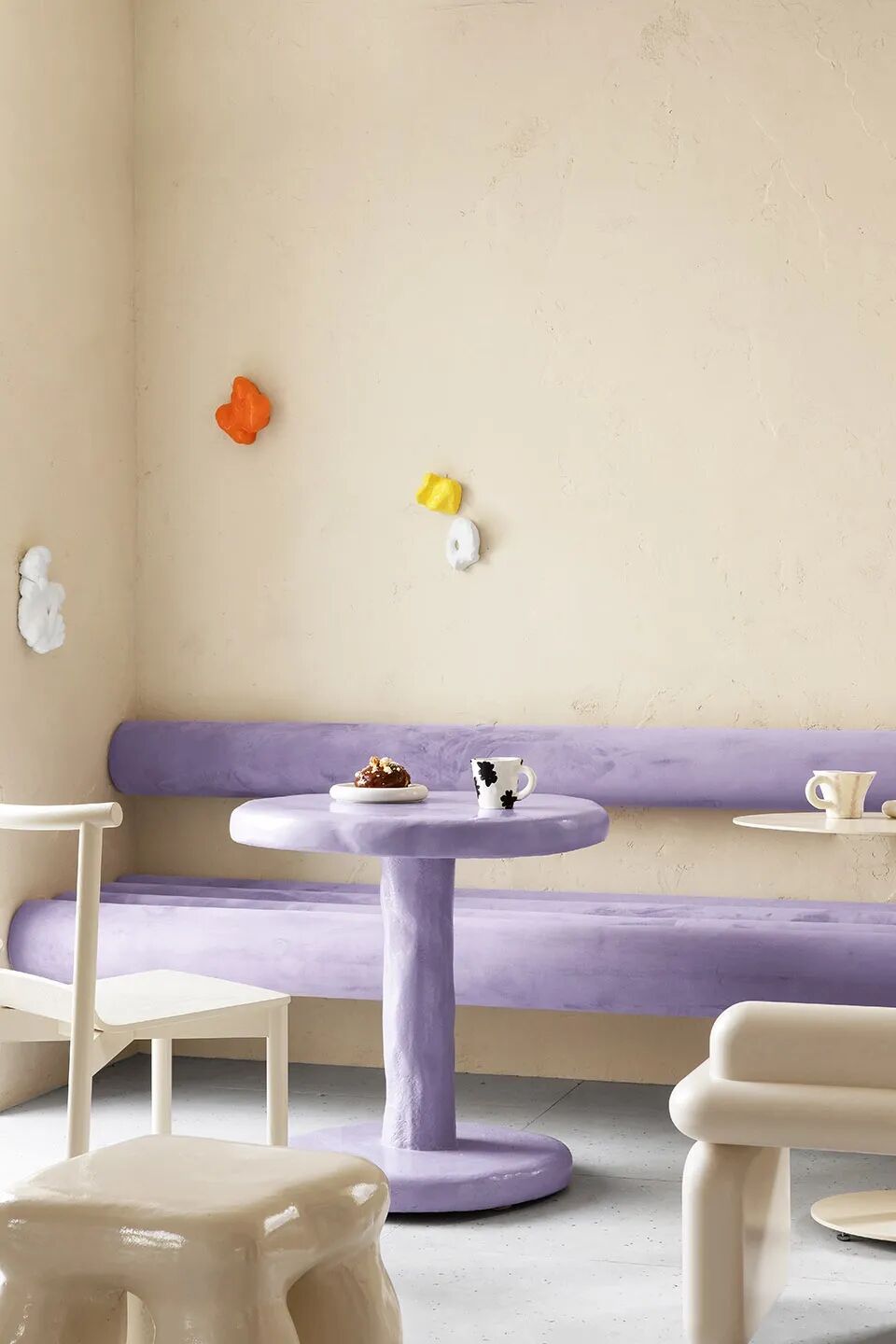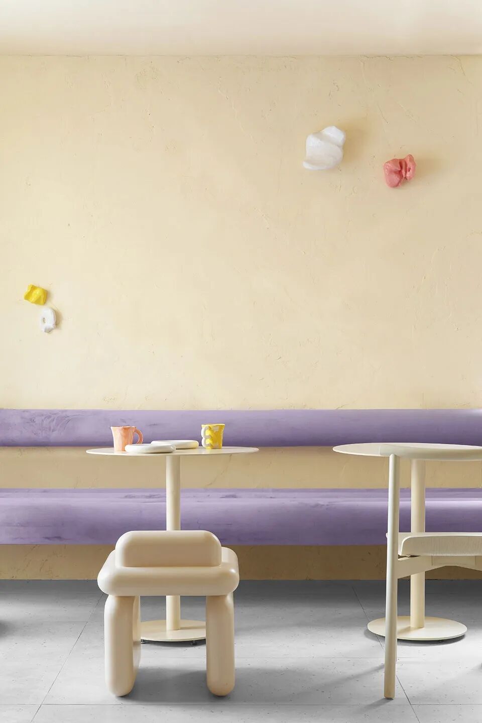 紫色咖啡馆位于伦敦标志性的国王大街,其所在的街区是20世纪英国时尚、音乐和流行文化潮流的代名词。Child Studio从场地的文化背景中汲取灵感,尤其是上世纪中期开始在伦敦西区出现的‘Formica咖啡厅’——它们通常由意大利的移民家庭开设,提供简单的小吃和饮料,室内装修简约而具有现代感,多采用层压板表面以及柔和淡雅的配色。席卷国王大街乃至整个伦敦的“咖啡馆文化”正是从这里发源。