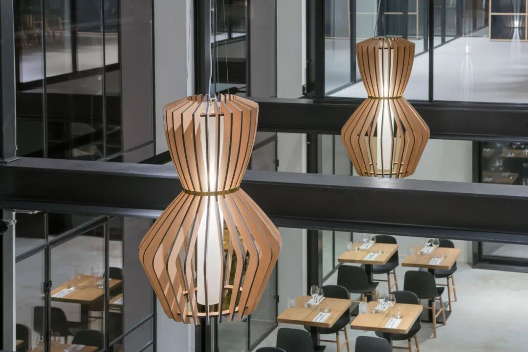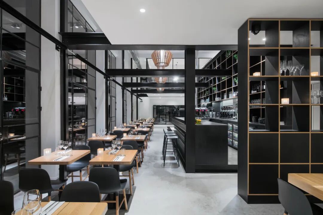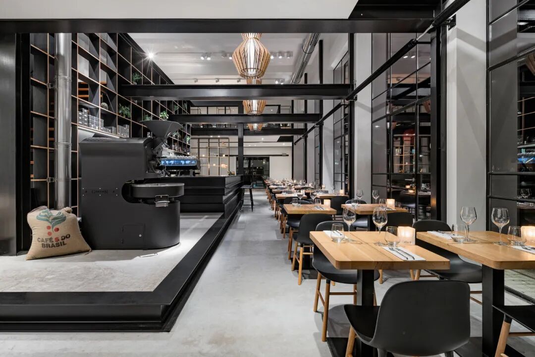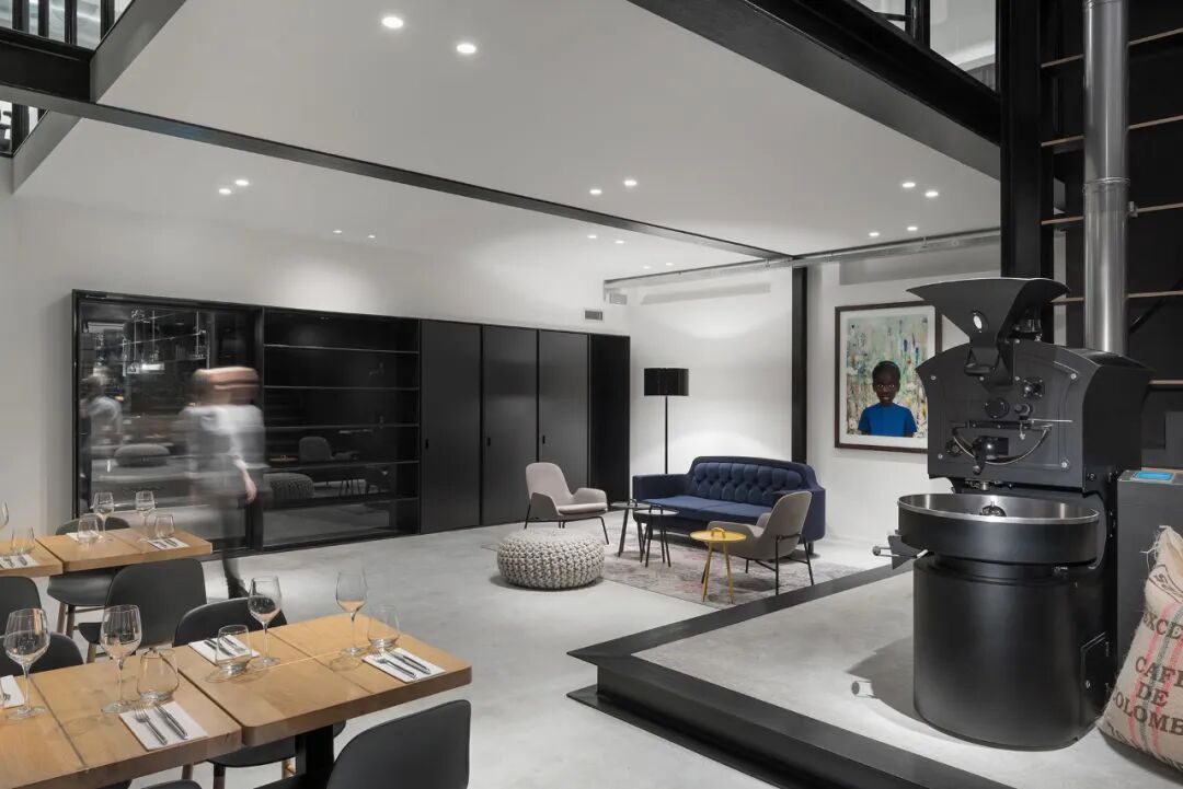 一楼作为咖啡烘焙店、咖啡吧、休息室和餐厅,一楼则作为咖啡师培训中心、展厅、办公室和Caprioe咖啡服务的会议室。通过引入一个带有4.5米高黑色钢筋元素的中央空隙,这两层与会议室在视觉上相连,成为监督餐厅的照明“灯笼”。