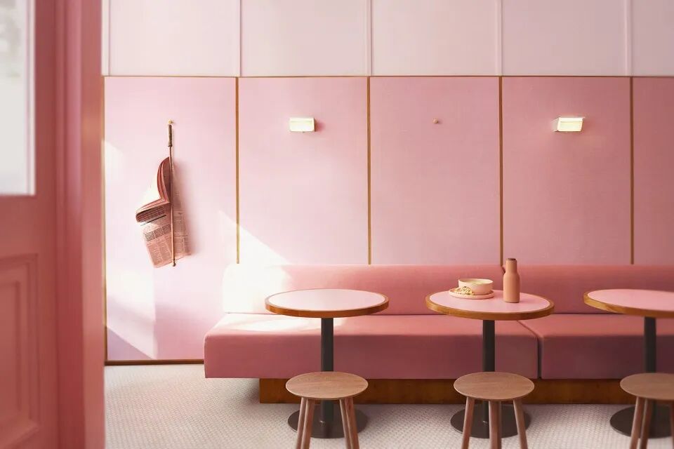 充满活力的室内空间完全被糖果粉色的Formica饰面板覆盖,从墙壁一直延伸到柜台和桌面。樱桃木材质的边框增强了这些壁板的节奏感,同时与马赛克瓷砖地面、樱桃木置物架和霓虹灯等一系列精妙的细部形成呼应。具有上世纪中期经典风格的灯具由欧洲设计师Poul Henningsen、Jacques Biny和Luigi Massoni设计。
