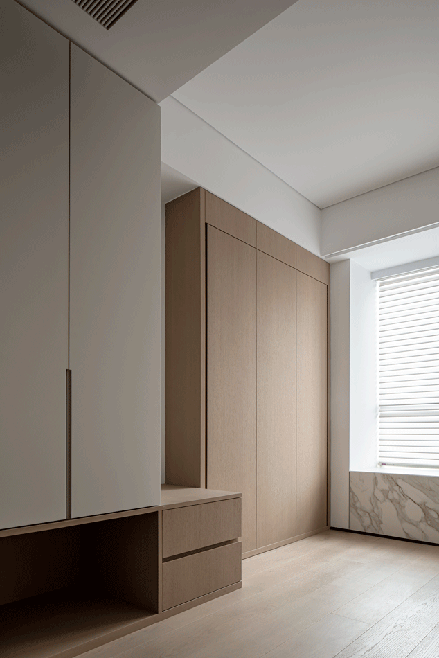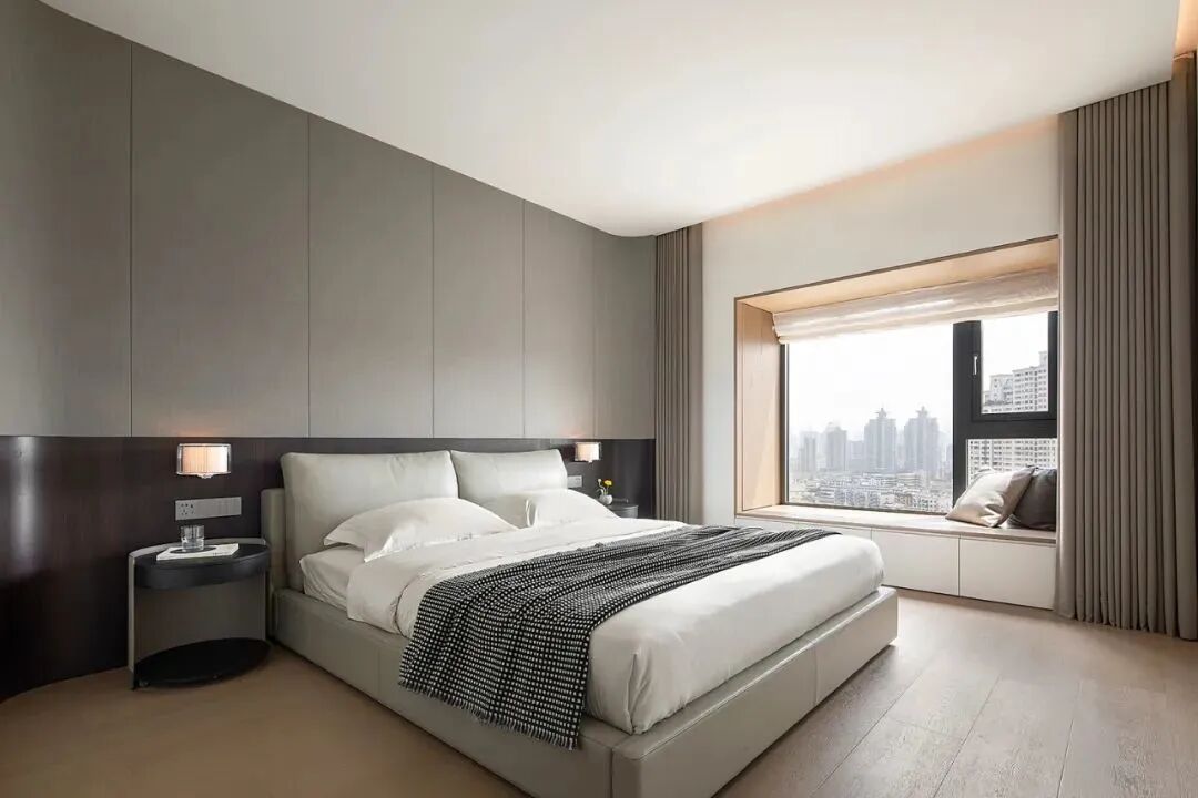 卧室同样以微水泥搭配原木饰面板,空间静谧祥和。