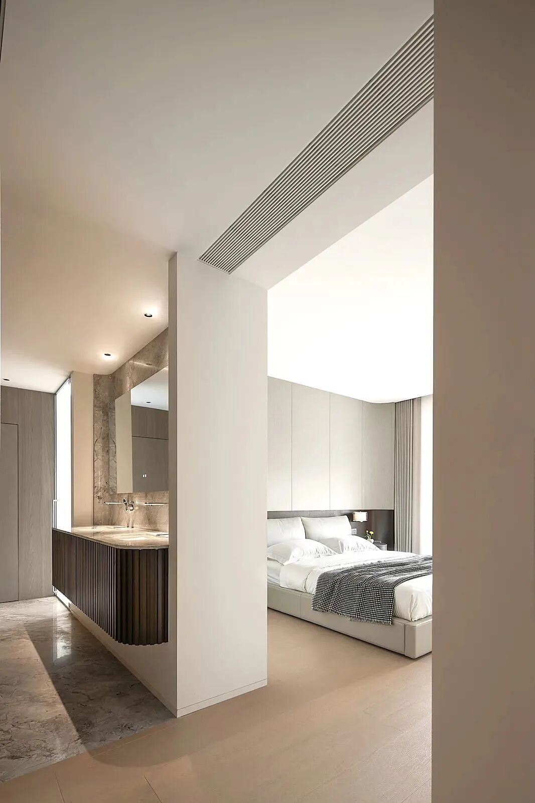 设计师赋予空间构想时将主卧室重新做了分区规划,使得卫生间三个功能独立划分开,进行分离使用的模式,从而形成开放式动线,使得主卧的布局在视觉上提供更多的通透与自由。