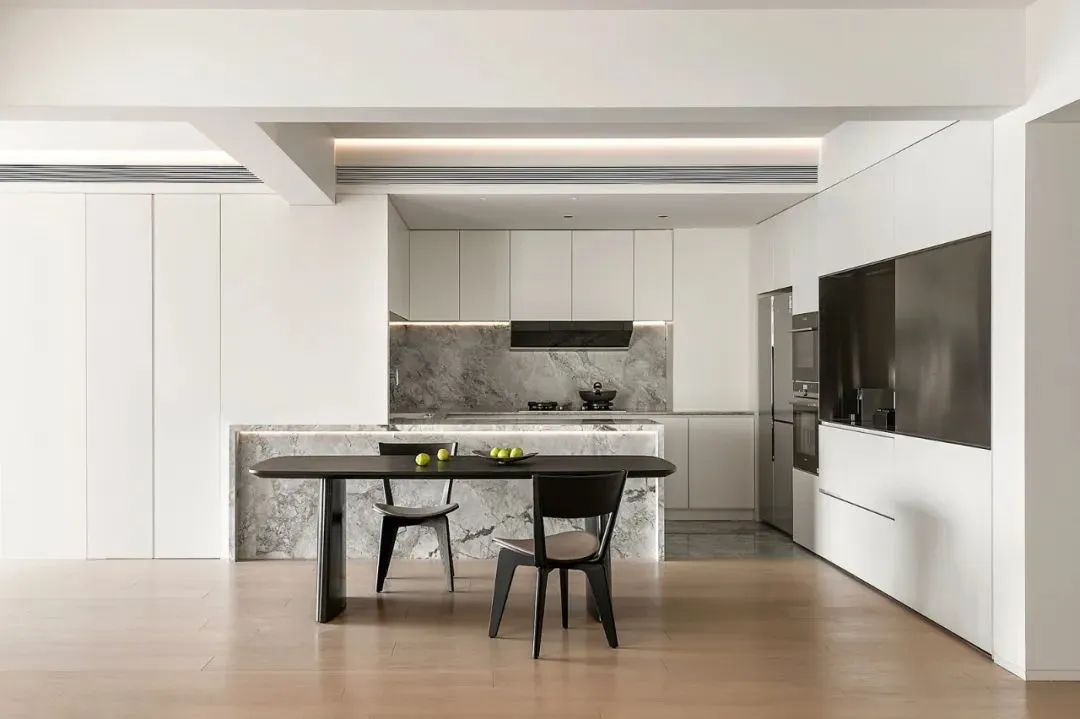 餐桌岛台一体化,拓宽厨房的区域。增加功能性、实用性。