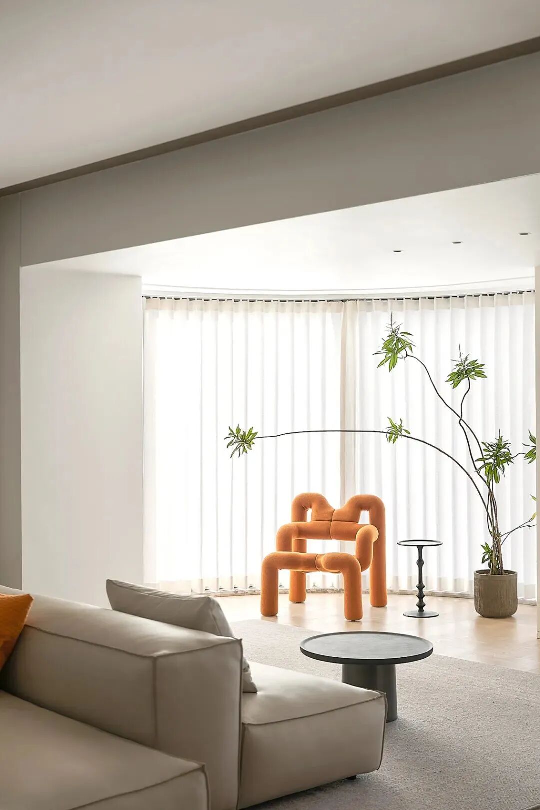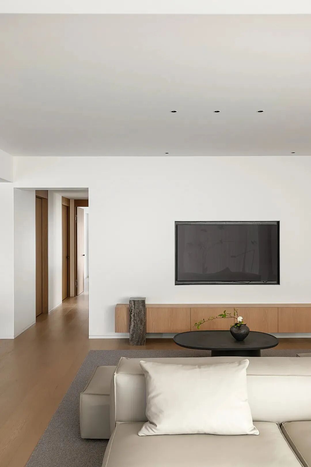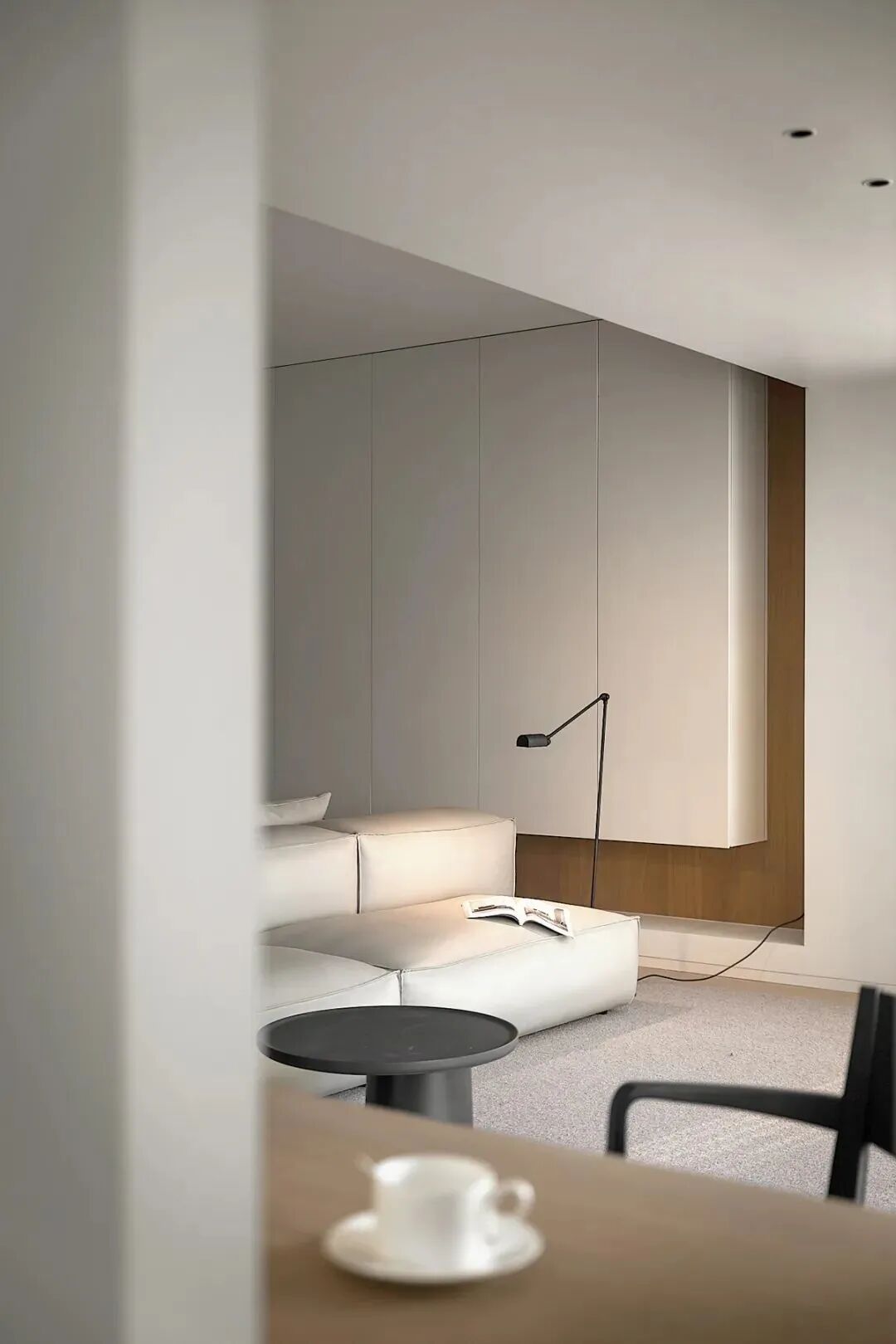 家让会客厅承载了更多的包容性。结构、材质、色彩的不同,看起来却如此地舒适与和谐。流光暗藏的柜体、华韵内敛的电视柜,谦退交融的空间体块、素白简静的灰白色调、素洁安然的灯光,在方寸之地营造出予人以无限想象余地的空间。
