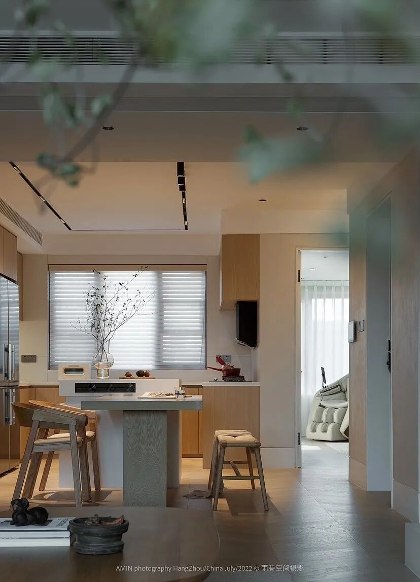 设计师尽可能将室内公共部分的空间联系在一起。开放性的厨房和餐厅,与客厅产生互动,有了更紧密的联系。给予家人更多精神上和言语上的交流。在这样一个空间中能够随心自在地享受温暖与感动,进一步唤醒了屋主对美好生活的向往。