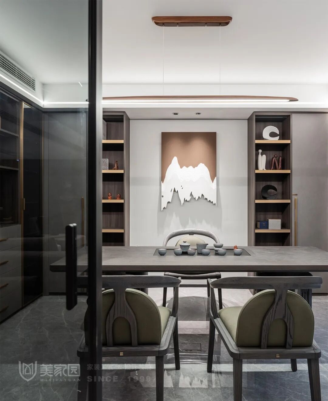 岩板+栅格电视背景墙,电视做嵌入式设计,使墙面造型更整体。贯穿整个客厅的格栅与灯光相结合,丰富空间层次,韵味十足。