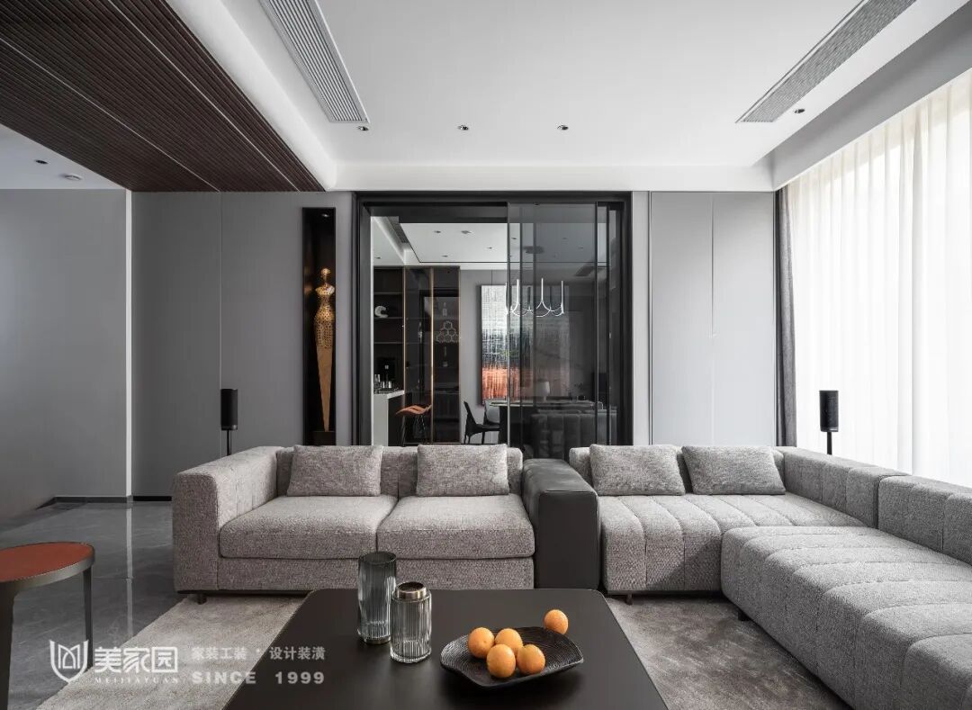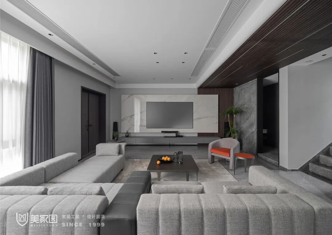 客厅的整体基调以灰色为主,搭配沉稳木色和爵士白岩板效果,定义空间稳重内敛的性格。