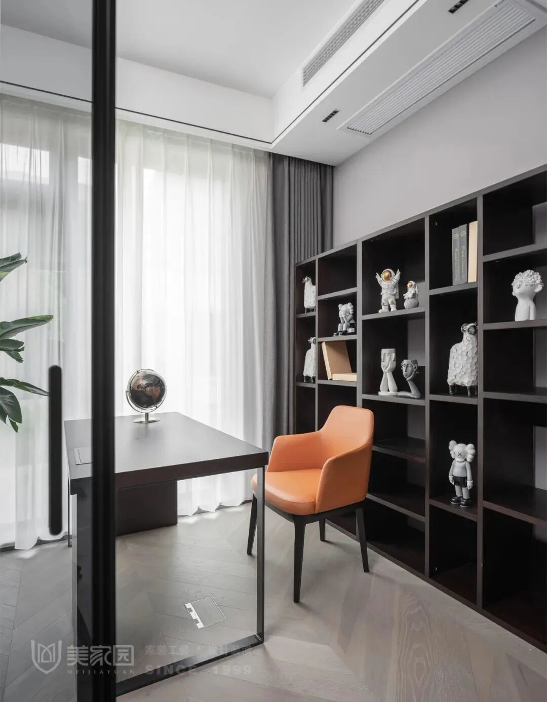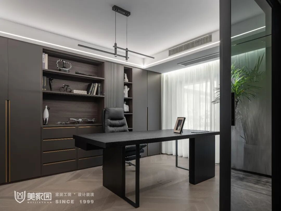 静谧的书房是男孩房的套房,窗边可见院落内的小景,适合眺望与阅读。