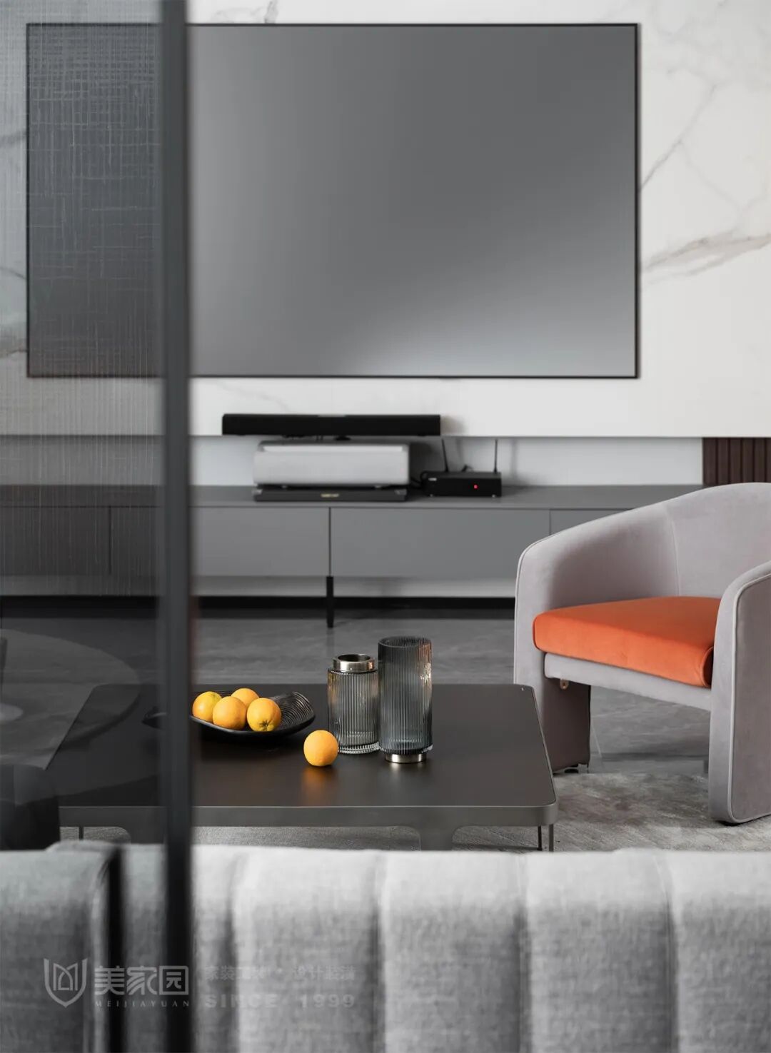 单人沙发用橙色系一笔点亮,活力潮流,奢华高贵的色彩,让人入目难忘。搭配不锈钢的方几与圆几,使得空间在材质、色彩上刚柔并济、碰撞且统一。