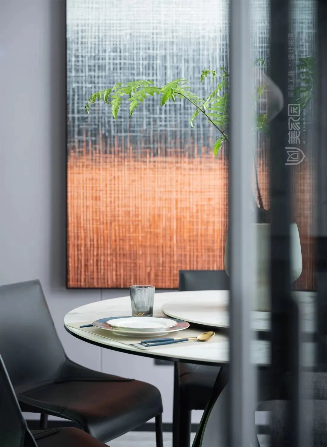 香槟金饰件从客厅延续至餐厅,金属所特有的的光芒与质感,是点缀也自成一色,打破空间沉闷,赋予现代生活的品质感。