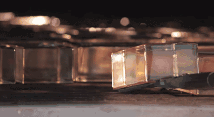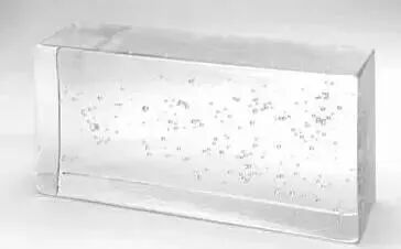 等玻璃砖初步固定成形之后,再把通红的玻璃扔入水中冷却,接着进行打磨,要经过好几道的打磨工序最后才能变成晶莹剔透的一个个果冻似的豆腐块。表面光滑透亮如水晶,质地坚硬耐磨如水晶,因此又叫做水晶砖。