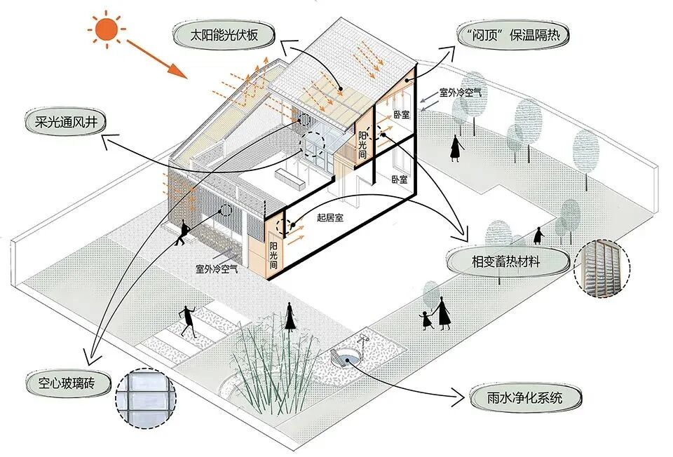 南向阳光间采用大面积空心玻璃砖和条形长窗