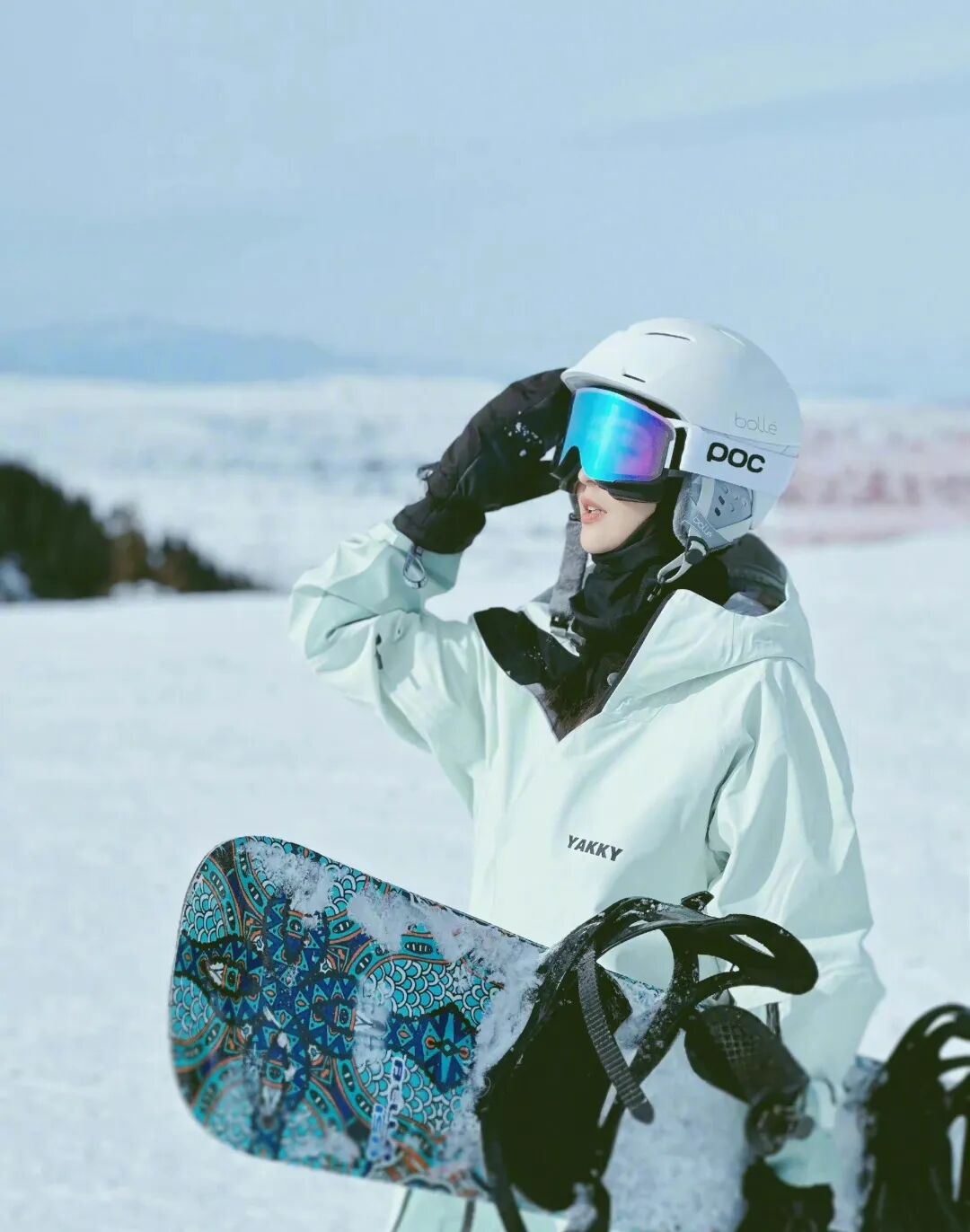 丫丫也分享了在新疆滑雪的照片,一身白色滑雪服,配上特殊印花的滑板,一整个演绎了雪中少女。