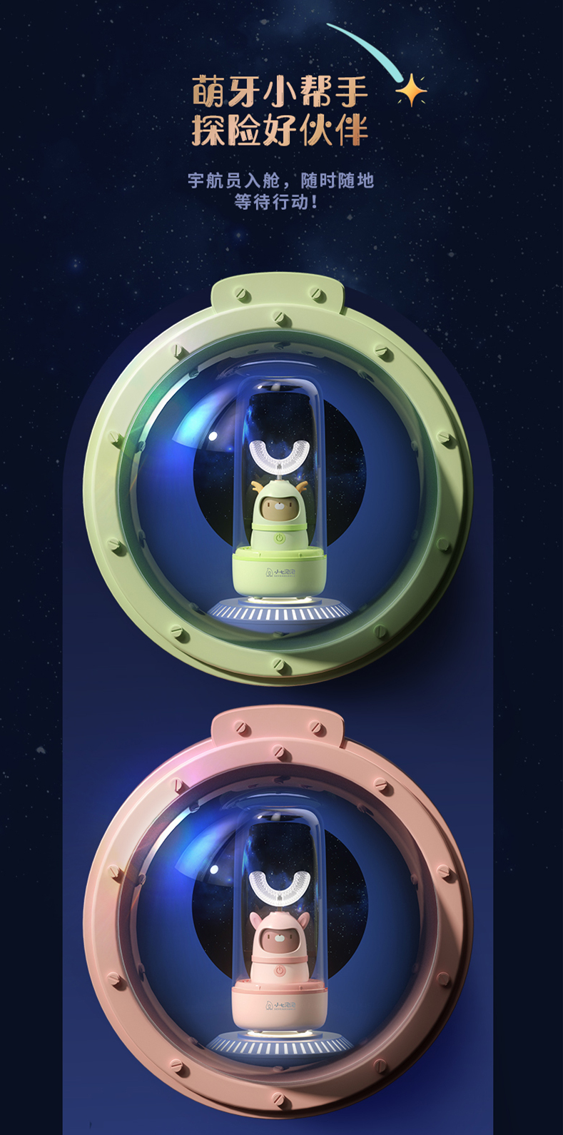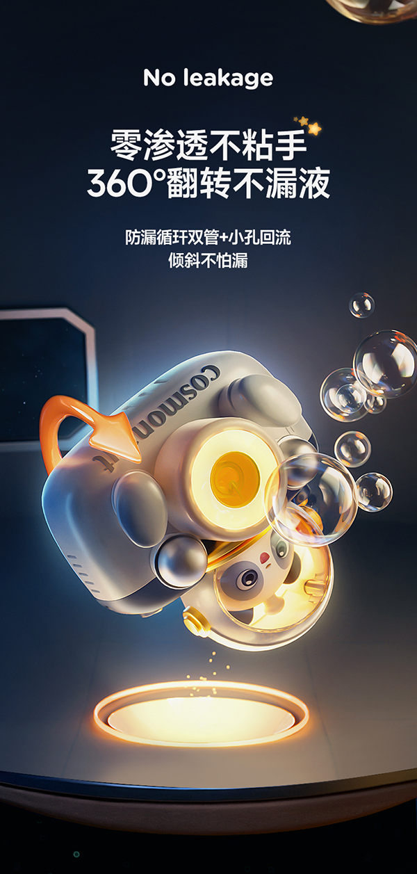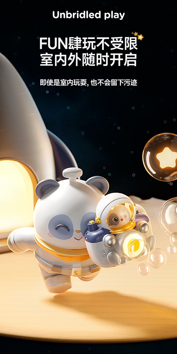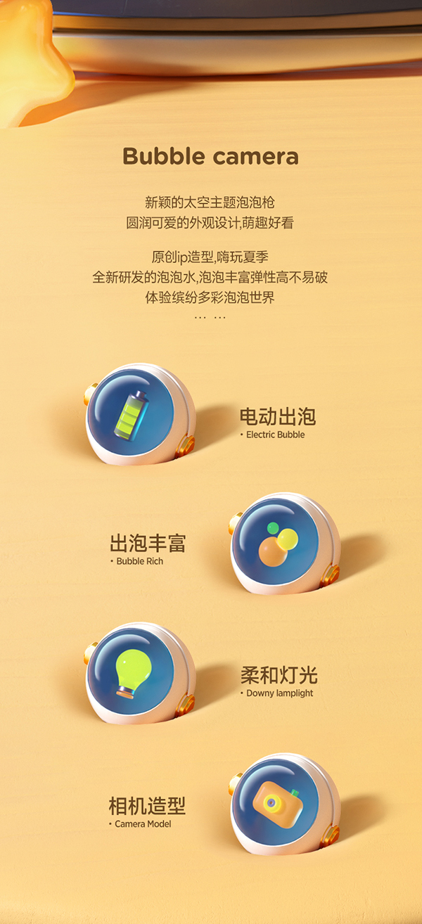 一款很有趣的详情页,整体细节和质感做的都不错,营造的氛围感也很强,让人有种置身欢乐太空的感觉。