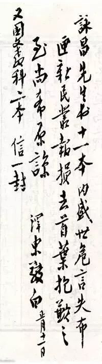 咏昌先生:书十一本,内《盛世危言》失布匣,《新民丛报》损去首叶,抱歉之至,尚希原谅。泽东敬白正月十一日又国文教科(书)两本,信一封。