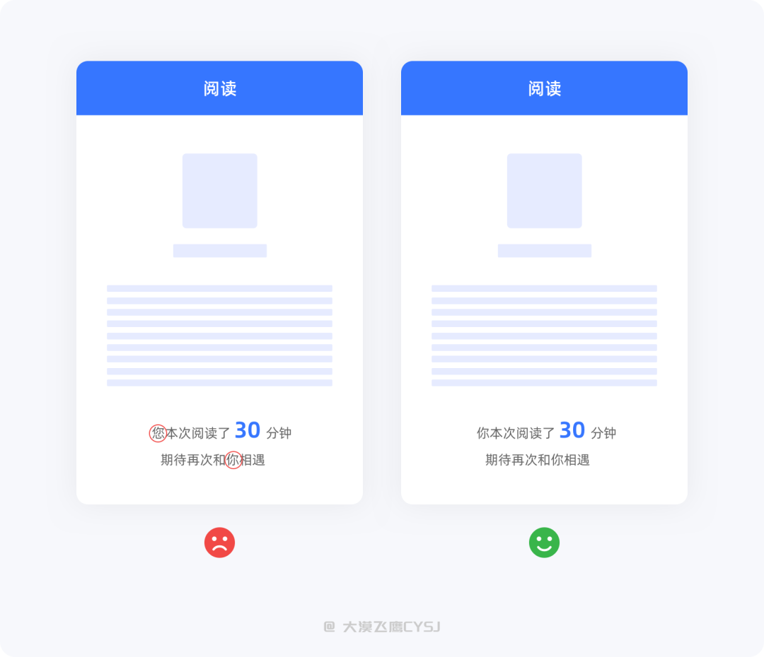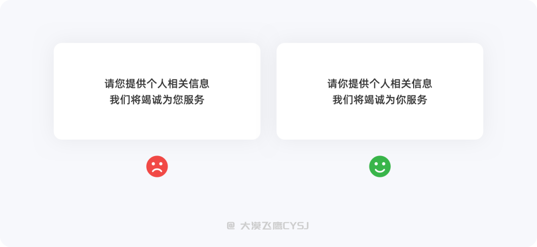 「你」-距离更近,有种打成一片的感觉,试想一下,如果你跟朋友之间总是过于尊敬、客客气气,很可能会缺少一种默契,至少不会去交心。产品也是一样,在交互过程中与用户扮演的就是「你」和「我」的角色,为了拉近与用户之间距离,不妨多使用「你」「我」跟用户进行交流,会更亲切。