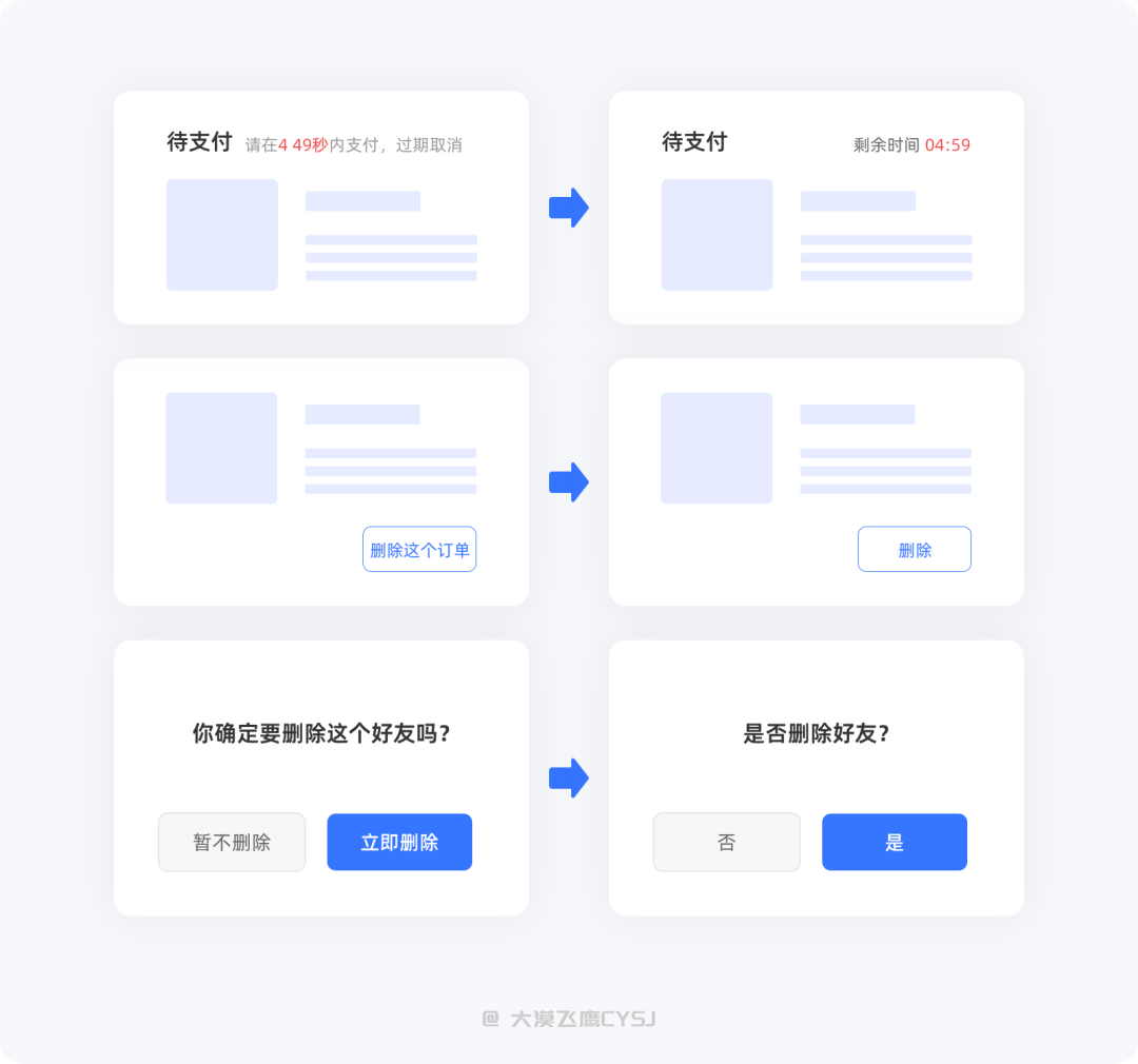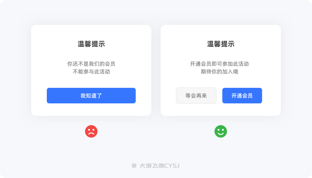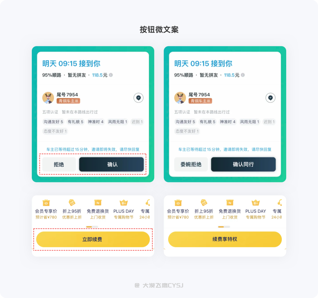 按钮是引导用户按下的关键因素,如果想要通过按钮为产品提高一定的转化率,那么你的按钮就需要一个优秀的微文案。通过下图中按钮微文案的左右对比,你更倾向于哪一种呢?