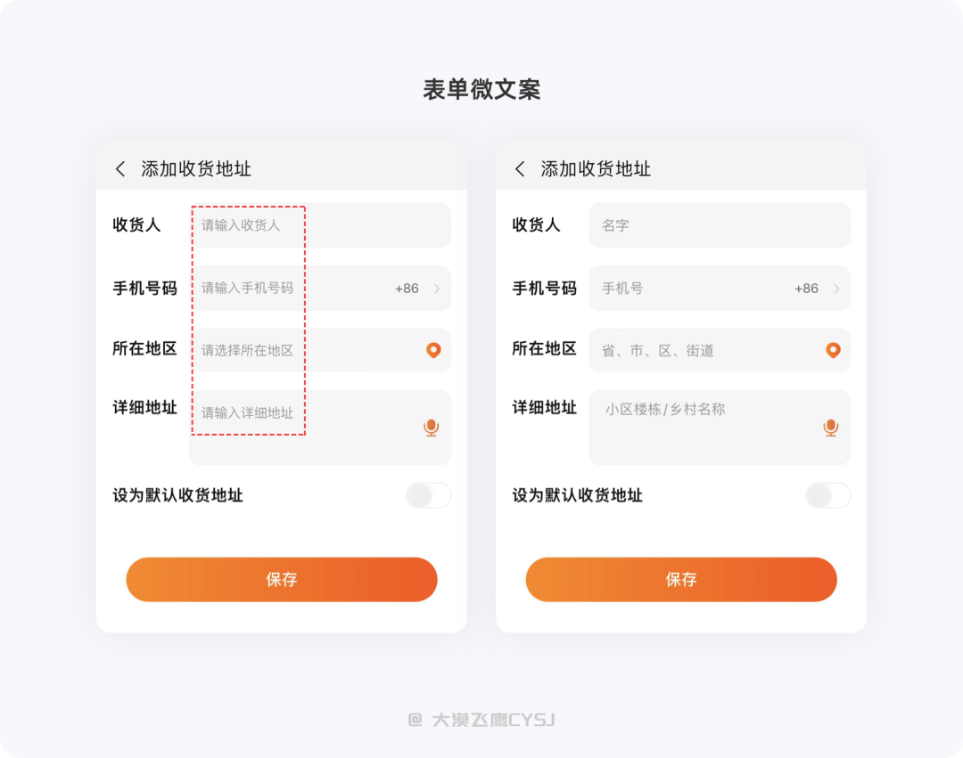 下图是淘宝新增地址的表单页面,左侧的占位符直接重复标签内容,没人说这种搞法是错误的,但右侧描述了应输入内容的说明、规则、注意事项等,明显降低完成表单内容的难度。设计师可能没有感觉,怎么看都能看懂,但有没有想过填写这个表单的用户根本不是互联网人群,只是第一次想在网上买个东西而已。