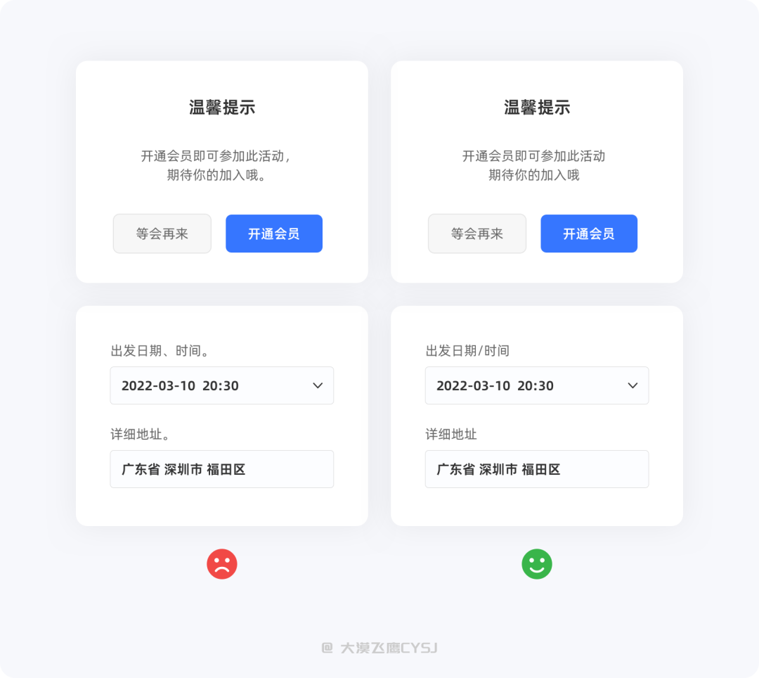 对同一类型事务/事件的微文案,其语法、语种都需要保持统一性的表达,避免因用词偏差增加用户认知负担。频繁出现的词汇如新增/新建、您/你、确定/是否...等,即便不影响用户理解,也需要在无歧义的情况下选择其中一种表达方式始终保持一致。