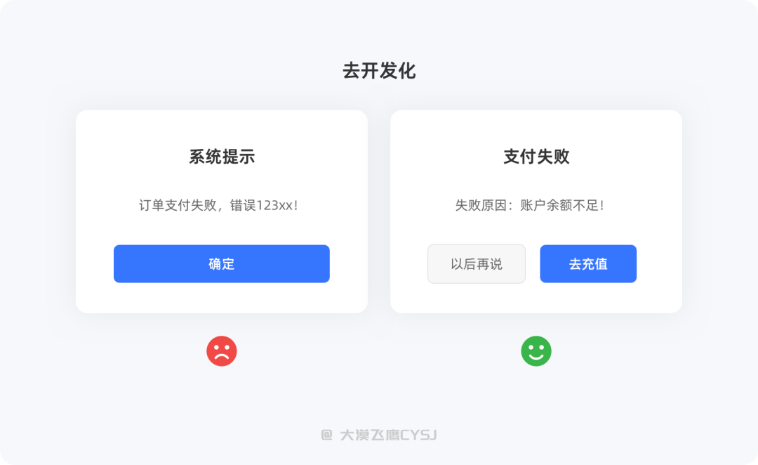 其次,避免模棱两可的文案,需要将发生的问题、行为指引等,清晰的表述出来,需要注意的是清晰表述并不是要长篇大论,能用词语表达的就绝不用句子、能用一句话标明就绝不多加半句,用户没有耐心来看你写小说。很多时候,用户在完成任务的过程中总是被很多「下一步」搞得一头雾水,用几个个字的简短描述来代替「下一步」需要完成的任务不是更好吗?当然刻意制造惊喜或氛围的除外,前提是你的惊喜真的能给用户或产品带来价值。