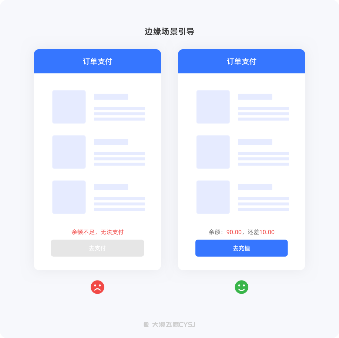 在一些特殊的场景下,微文案能起到安抚用户情绪、引导用户选择后续行为的作用。例如空状态/缺省页,可清楚的告知用户发生了什么问题以及解决方案,再通过按钮(按钮文案上述有说明)加以引导;在支付过程中,出现余额不足时,应明确提示金额还差多少、以及在附近提供便捷的充值入口;当用户有多张优惠券,下单时却无法选择使用,则需要将使用条件在原有文案的基础上强化、突出显示。