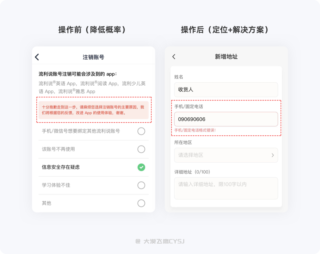 提示,并不仅仅是告知用户问题所在,而是需要在用户操作之前就给出温馨提示(如注销账号);出现问题后自动定位到具体位置并提供解决方案(如填写表单),如果实在无法解决,尽可能的提供备用方案或求助渠道,尽可能的降低用户损失(如误删某数据);操作即将完成或完成之后给予用户鼓励(如就差一点、太棒了)。