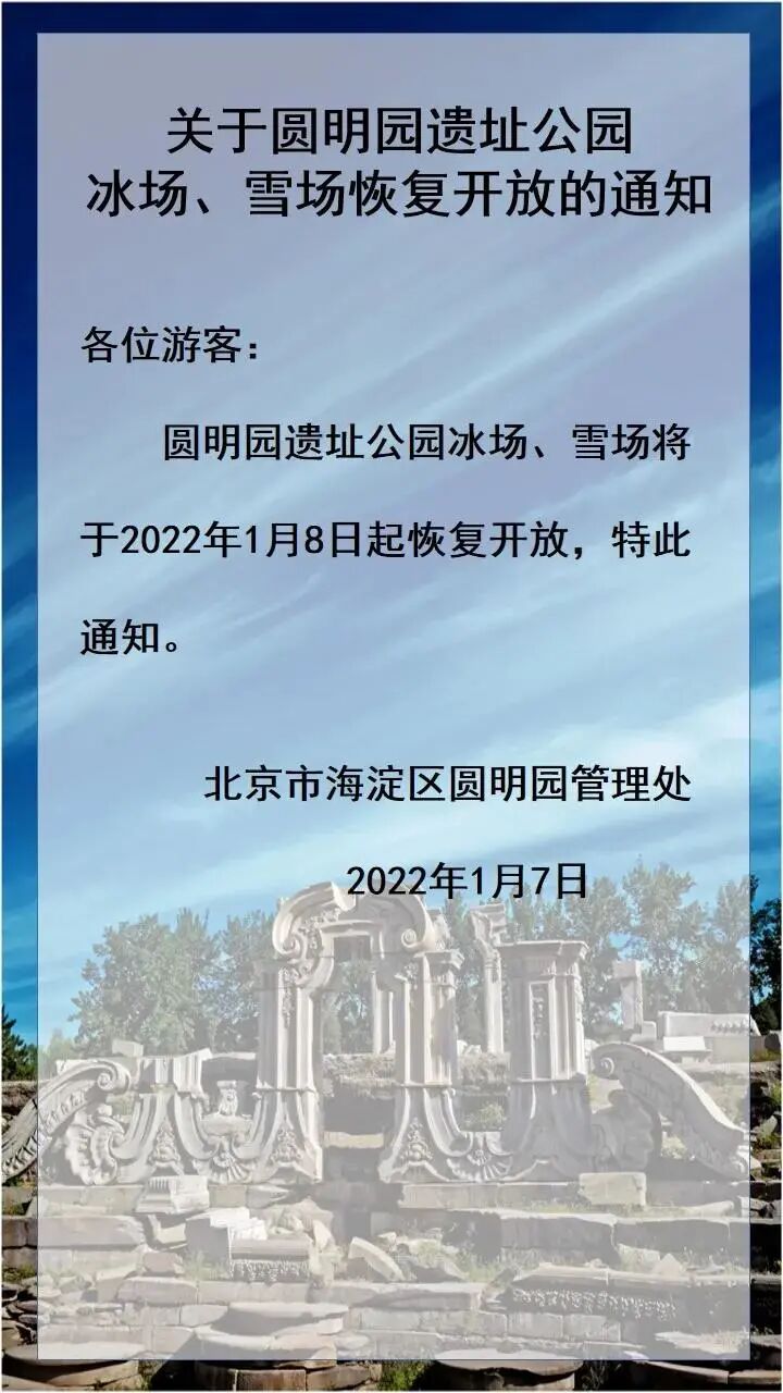 新京报快讯 据圆明园遗址公园官微7日消息,圆明园冰场、雪场8日起恢复开放。
