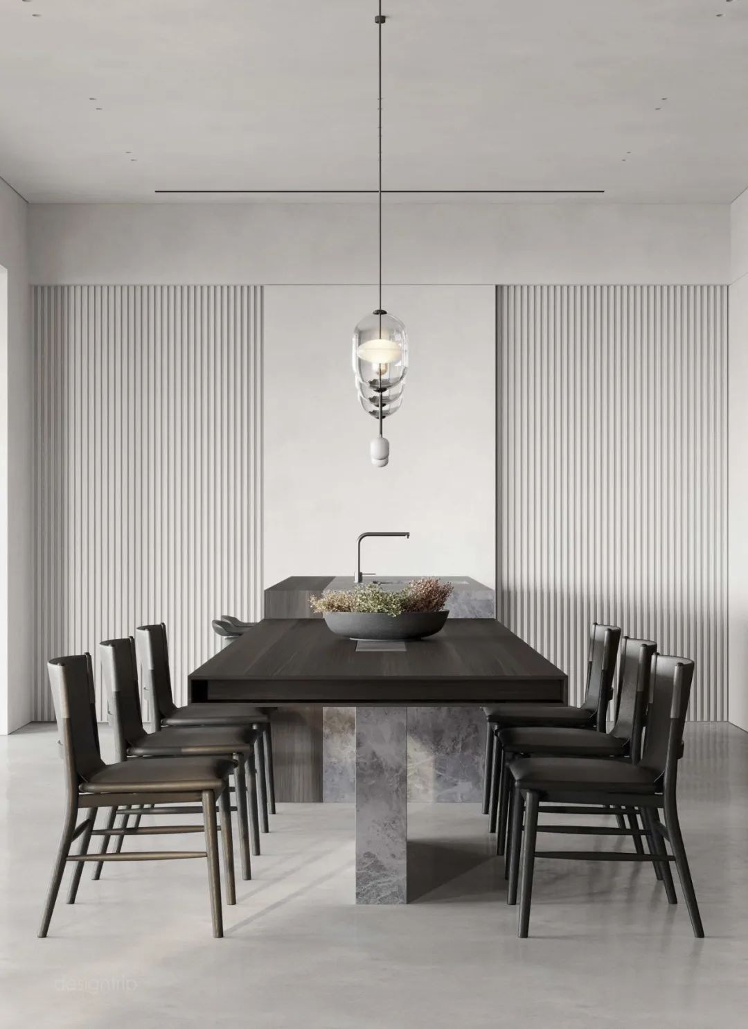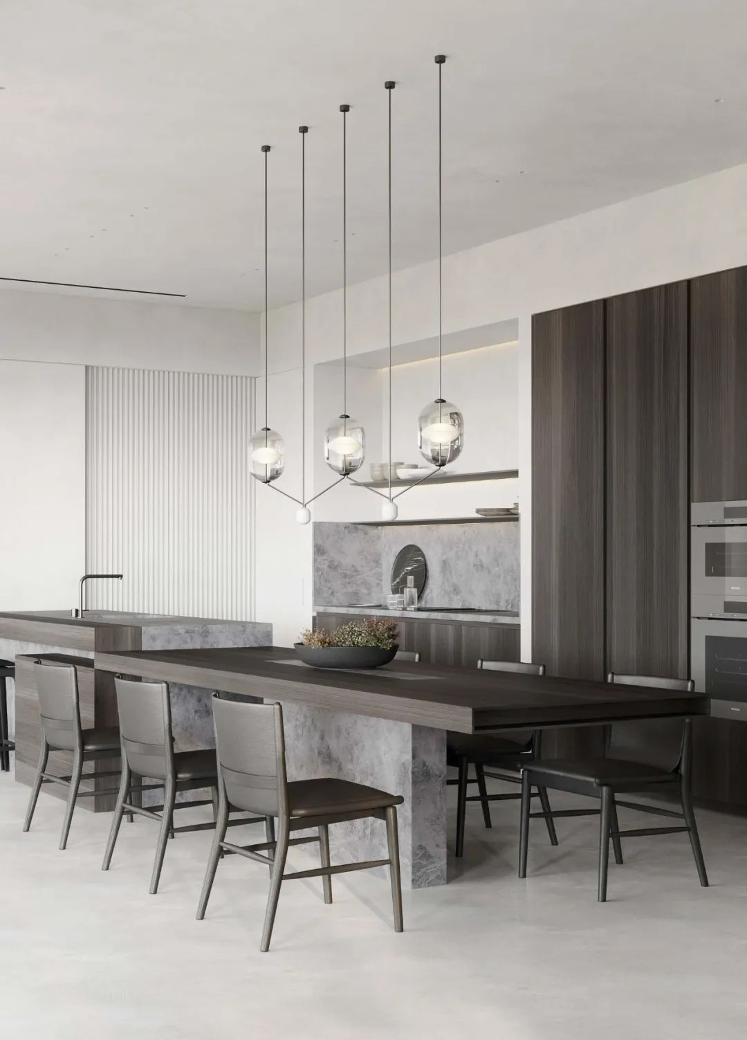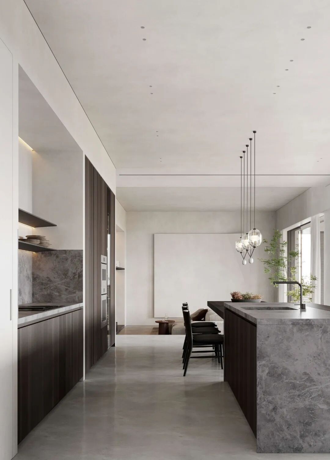 厨房与餐厅延续了空间的中性色调,在肌理和质感上更加突出。黑色的木板成为厨柜和餐桌的饰面,大理石的纹理缓慢扩张,协调黑白的中间色调。餐厅的背景墙是专门定制的,它的线条顺应了该区域的纵向视觉的设计,从餐桌上方的现代线形吊灯便可以看出来。