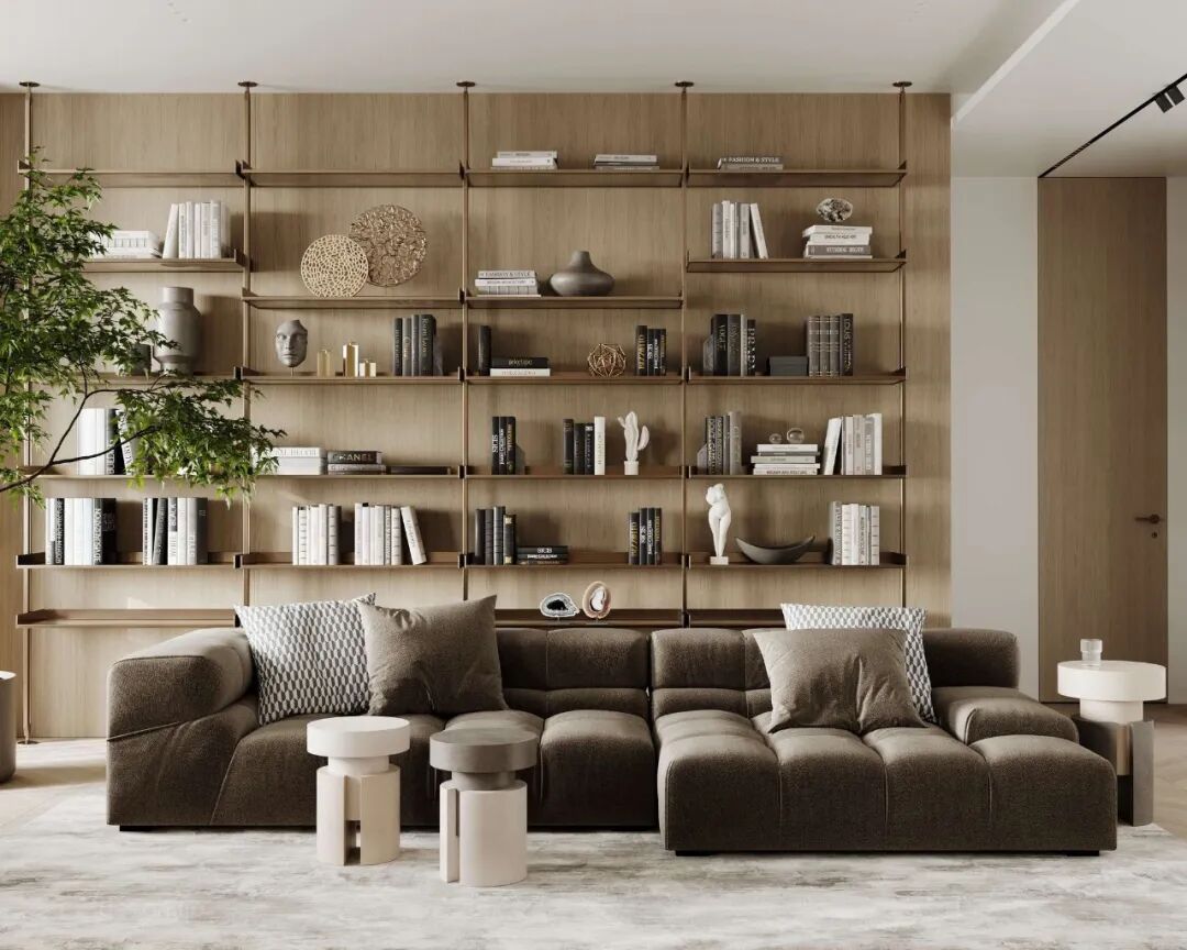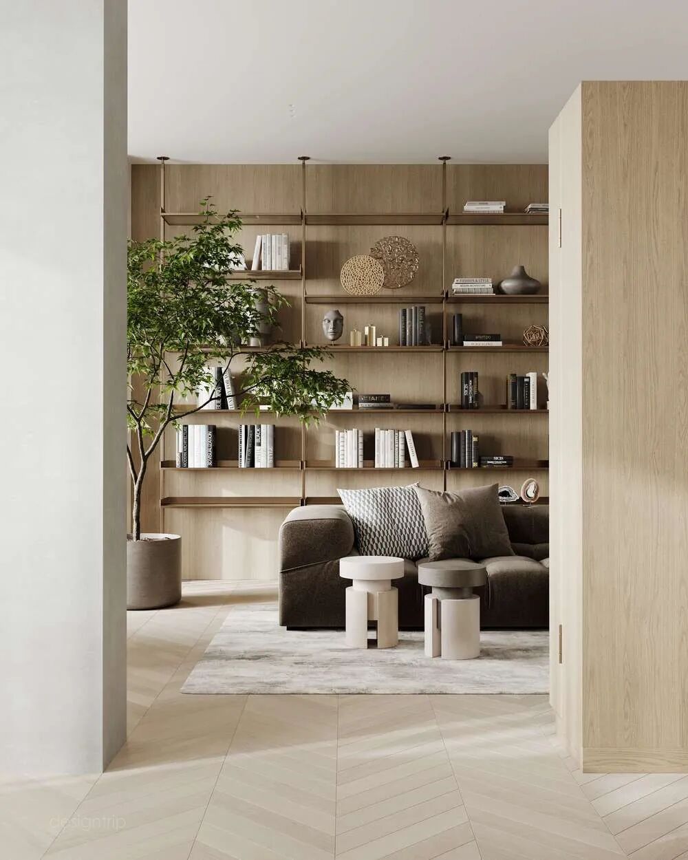 Artem Babayants在这所住宅中舍弃了单色主义,用木板制成的书架“独当一面”,在空间里进行了巧妙的色块拼接艺术。前景由一棵绿植进行点缀;简约的沙发从木中吸色,它与书架之间空隔出一个狭窄的走廊,加强客厅的流动性。对于光线,Artem Babayants也做了很好的把控,强烈的光线让整个空间充满生机。