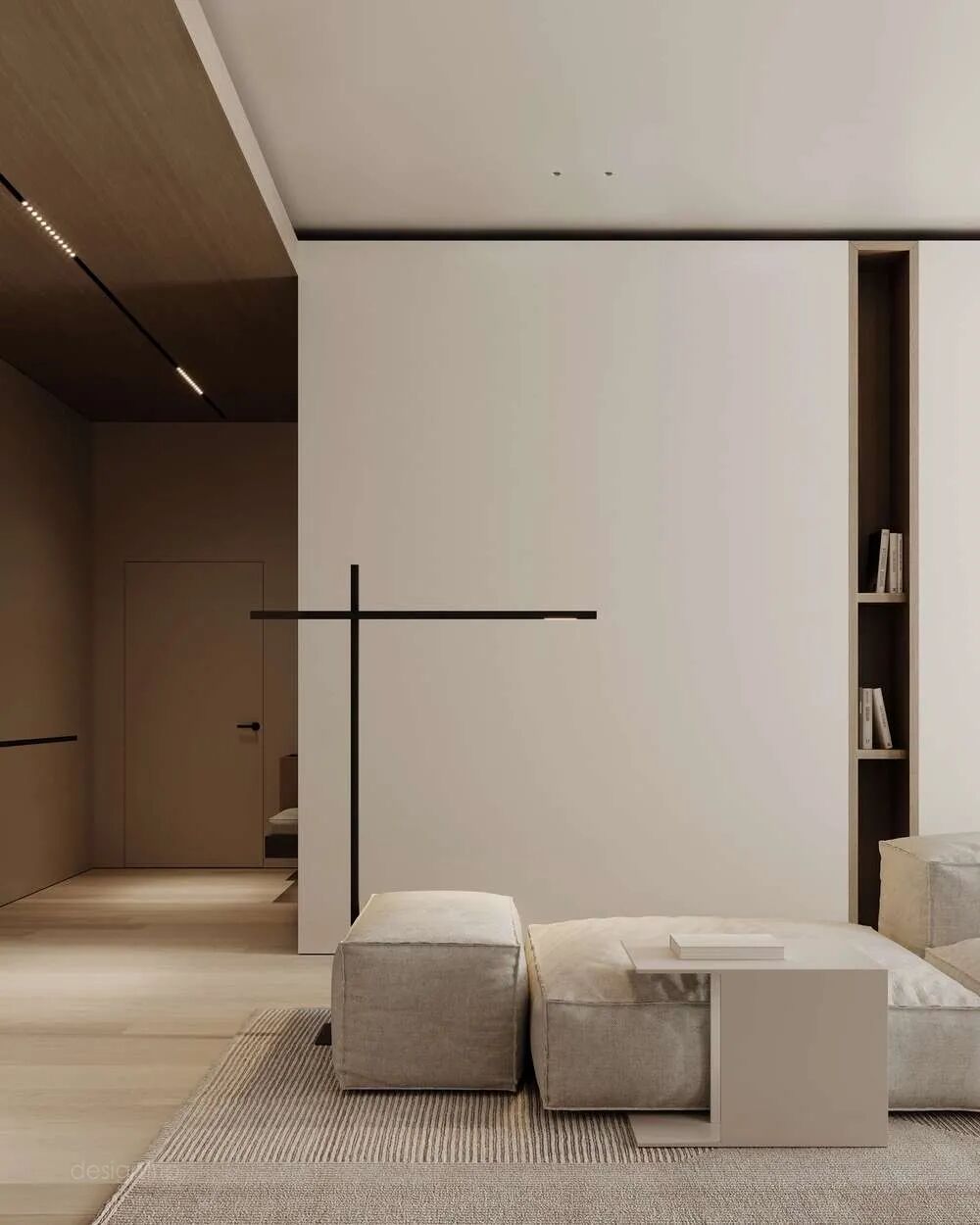 合理利用空间的留白,不使之成为空间的一个活跃元素,是Artem Babayants的擅长。客厅的布局沉稳大气,不多矫饰,以人为一切事物的中心,强调生活的本真。朴素的色调中,简约的家具构成生活的基本单位;偶尔的设计元素,如十字形落地灯,“压缩”在墙壁里的书架,皆为空间留下现代的艺术精神。