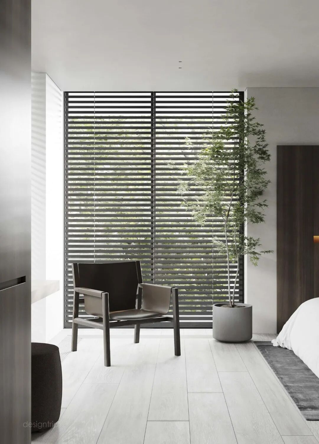 从公共区域到私人生活空间,都传递着极简的生活态度。地板在此从一体的大理石变换成为温暖的橡木,也暗示了屋主人对两个不同区域包含的不同情愫。并无繁杂,卧室是标准的功能区。住宅中所有窗户都采用百叶窗进行遮挡,这种传统而经典的手法经常用在极简住宅中。不难发现,百叶窗对自然景观有着相当成熟的处理方式,例如投射进来的阳光被艺术性切割,为极简风格的室内增添自然的诗意。