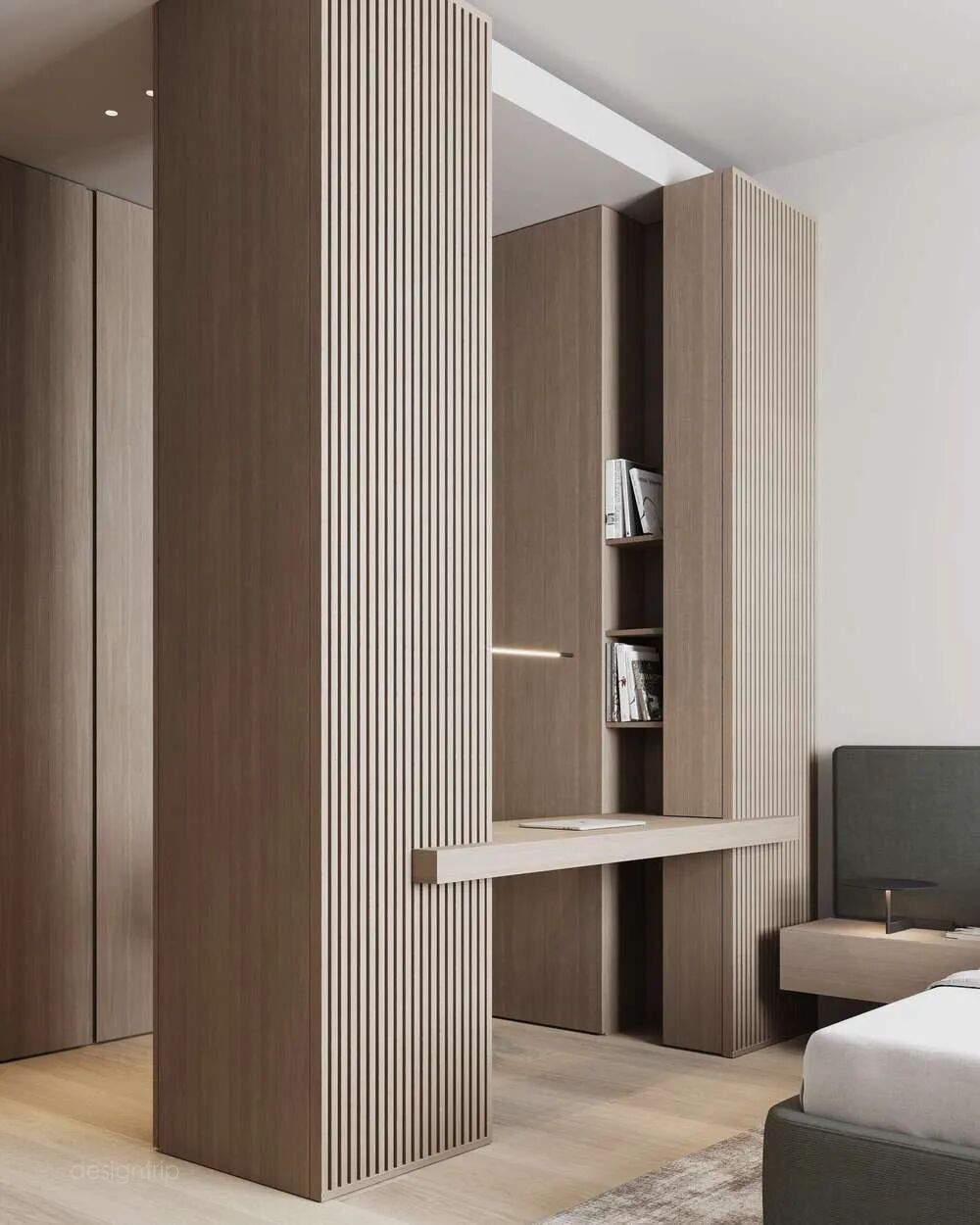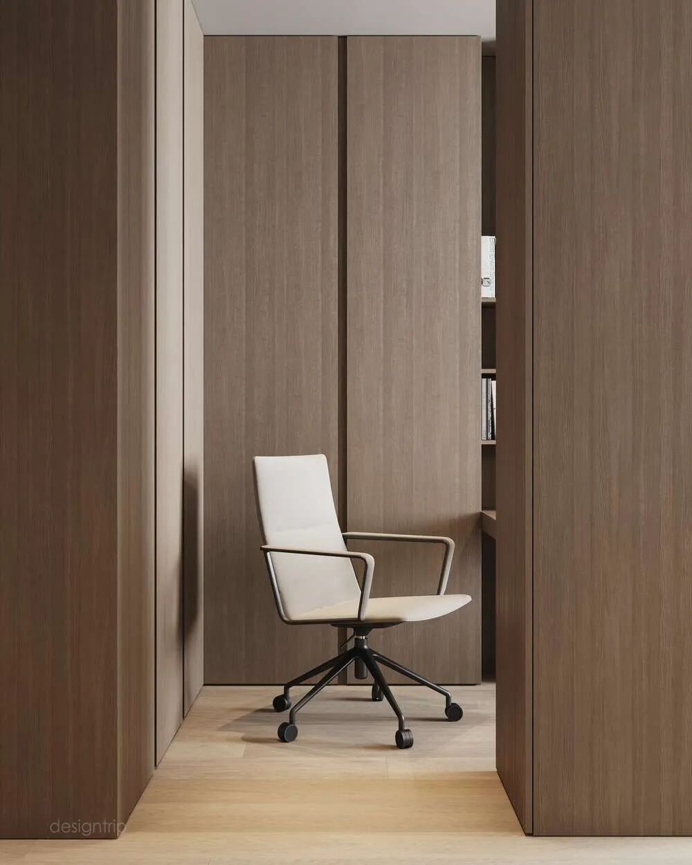 细木工在卧室打造了一个现代的工作小榭,利用承重柱在空间的联系,给人一种独特的生活体验。作为一个家庭公寓,Karamel将现代极简主义和理性主义融合,在细节的构成元素中表达业主的生活理想。